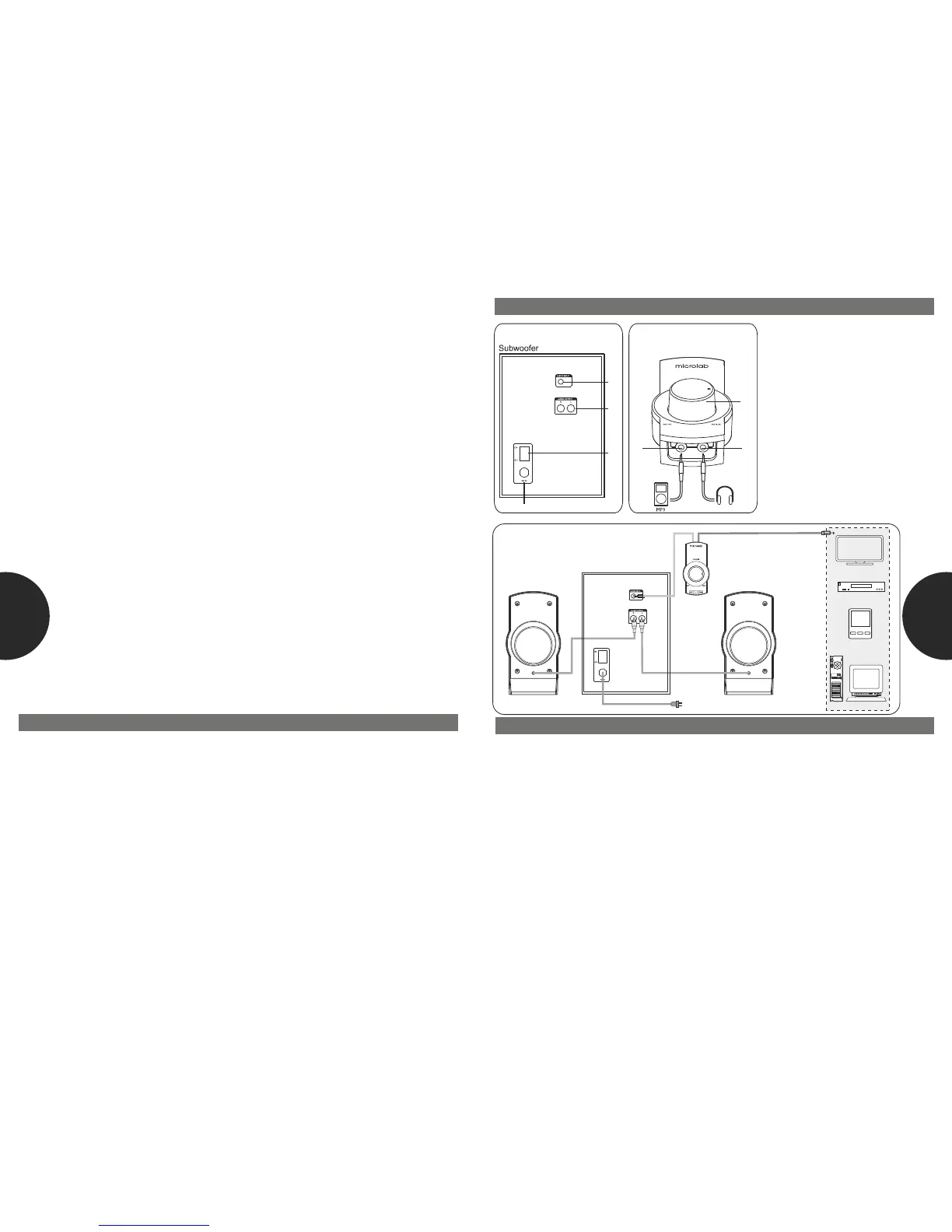 1. Podłącz wtyczki RCA obu głośników satelitarnych do wyjścia audio na przednim panelu subwoofera.