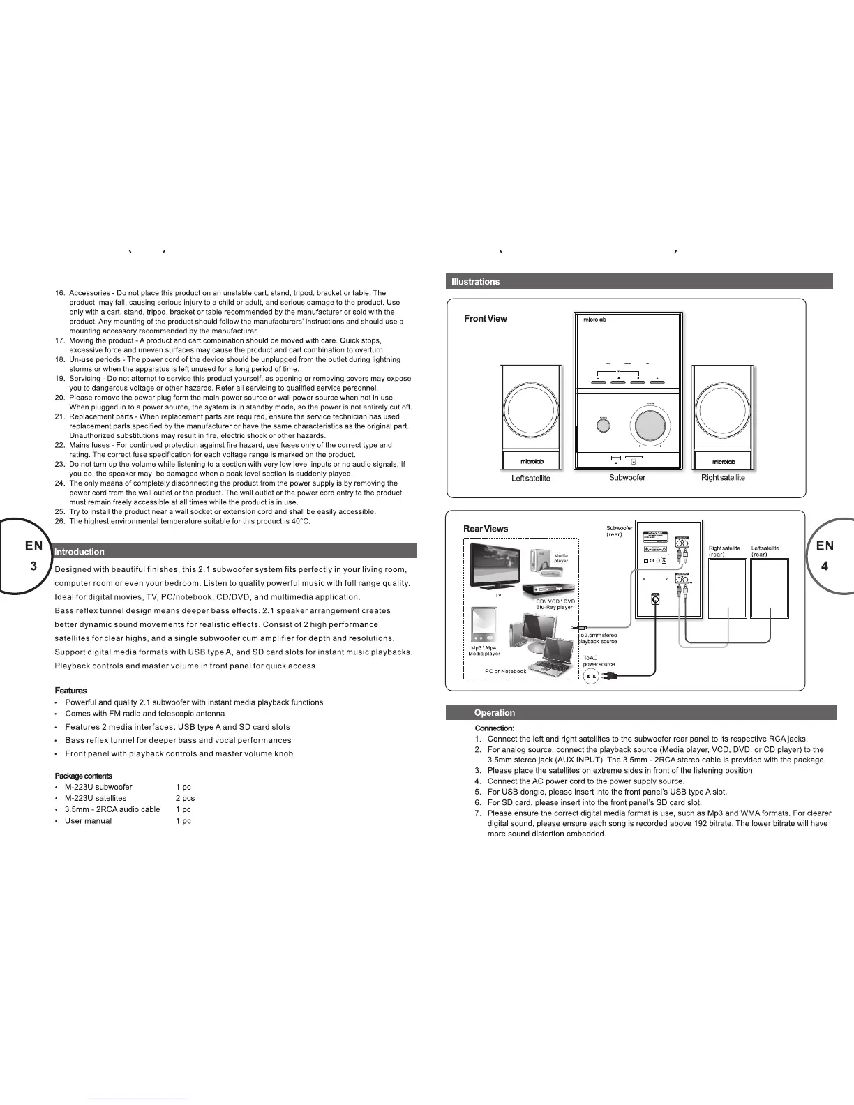 Microlab M-223U - Introduction; Features; Package Contents; Operation