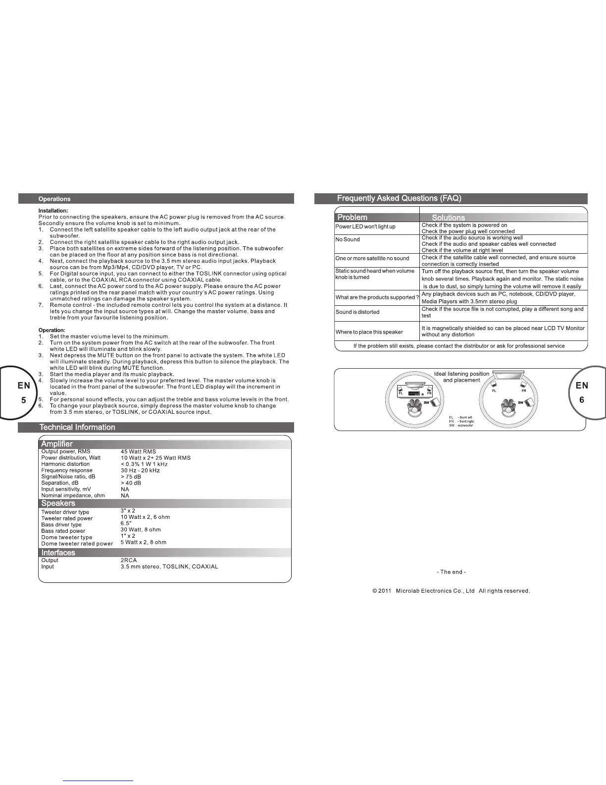 Microlab M-910 - Operations; Installation; Frequently Asked Questions (FAQ); Technical Information