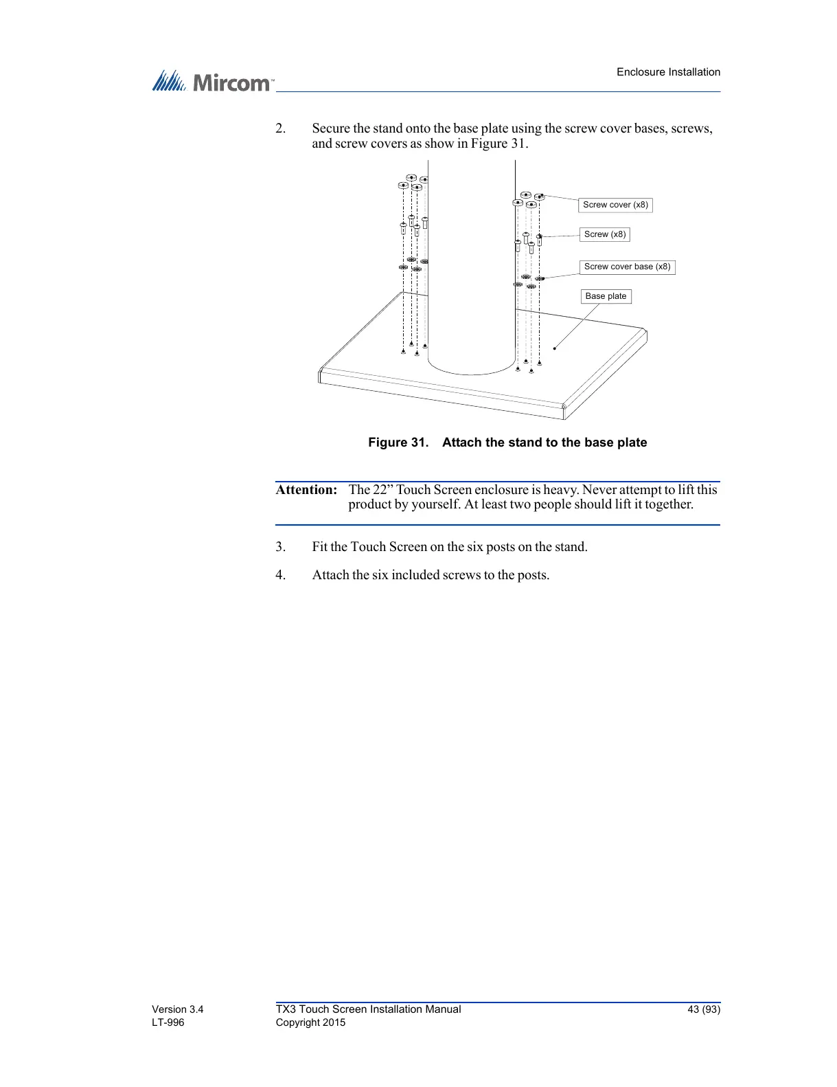 2. Secure the stand onto the base plate using the screw cover bases, screws,