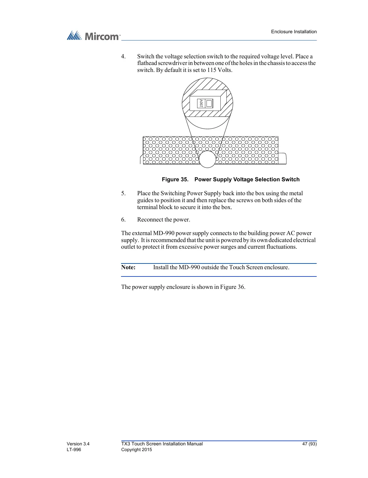 Note: Install the MD-990 outside the Touch Screen enclosure.