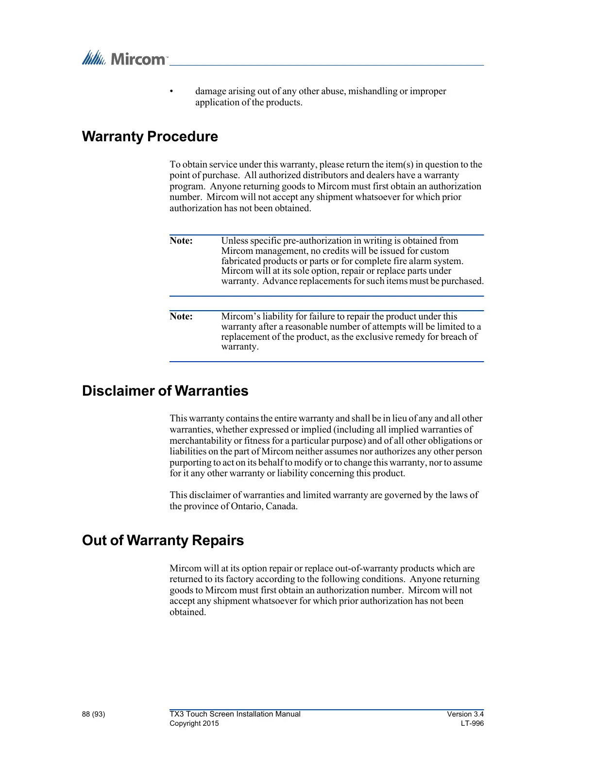 Note: Mircom’s liability for failure to repair the product under this