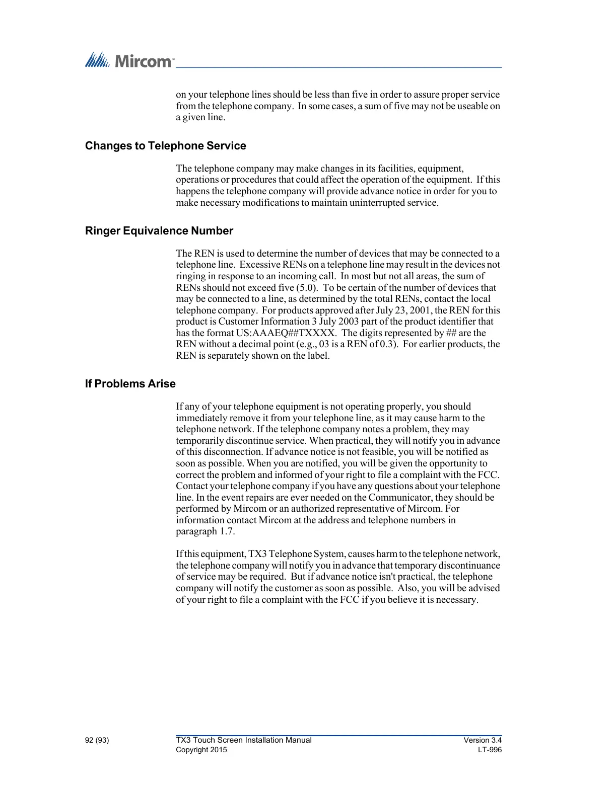 92 (93) TX3 Touch Screen Installation Manual Version 3.4