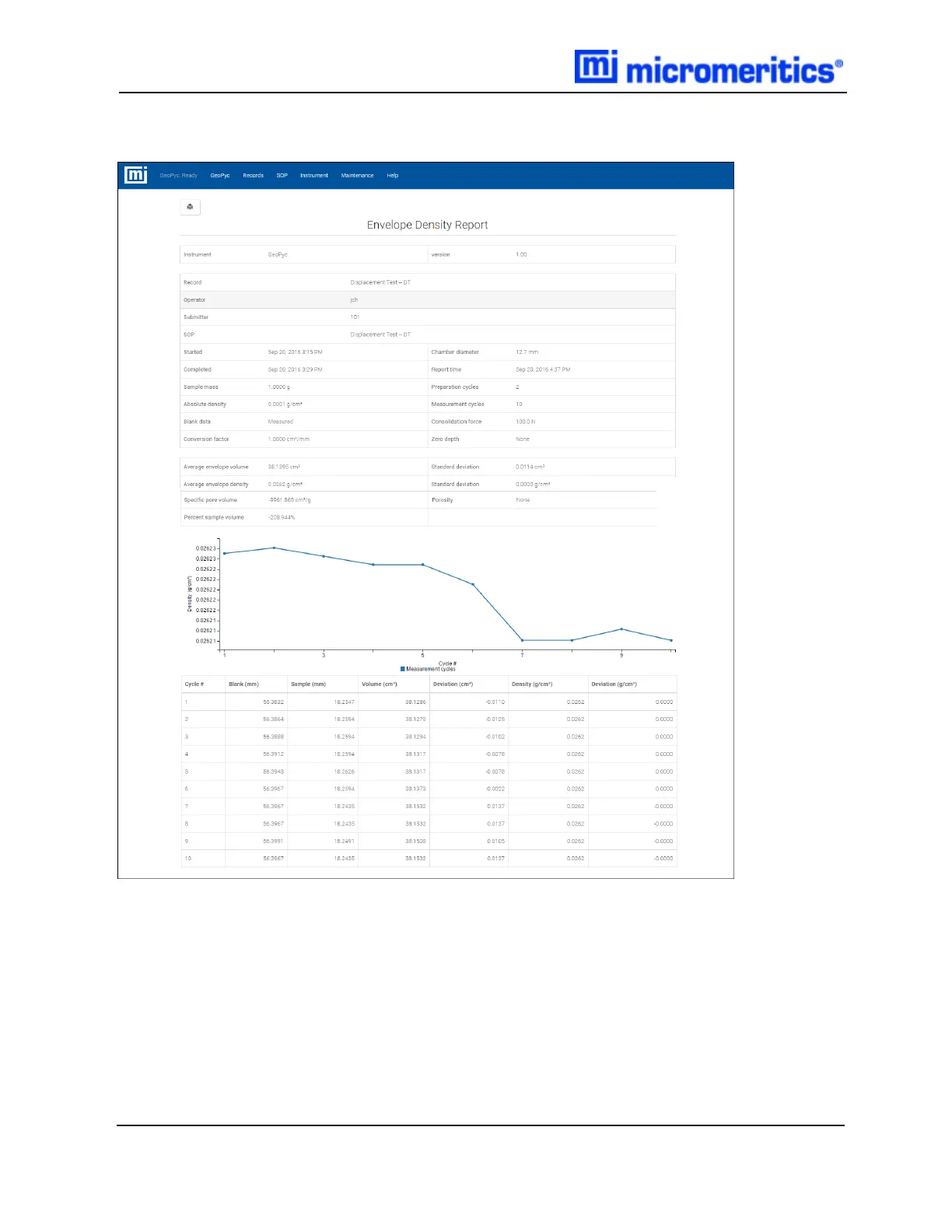 run. The report also displays average envelope volume and its standard deviation, and average