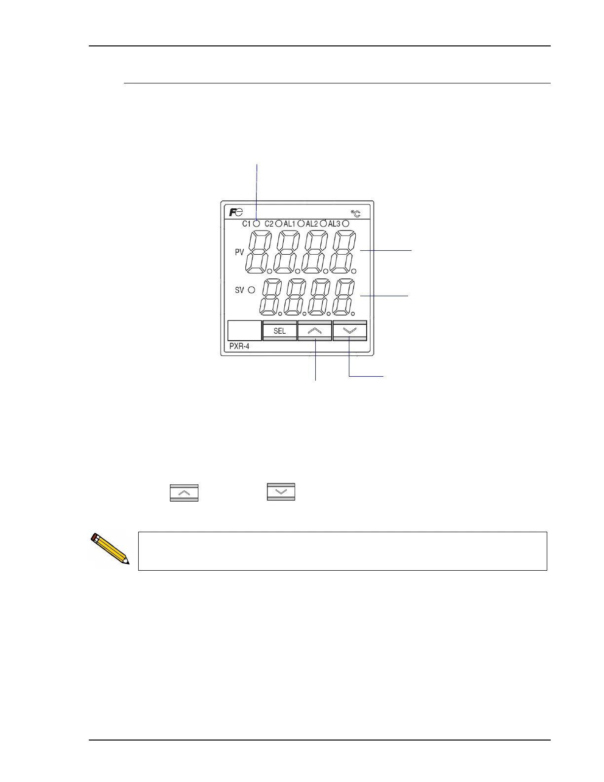 The controller always displays the current temperature (PV = Process Value) and the set point