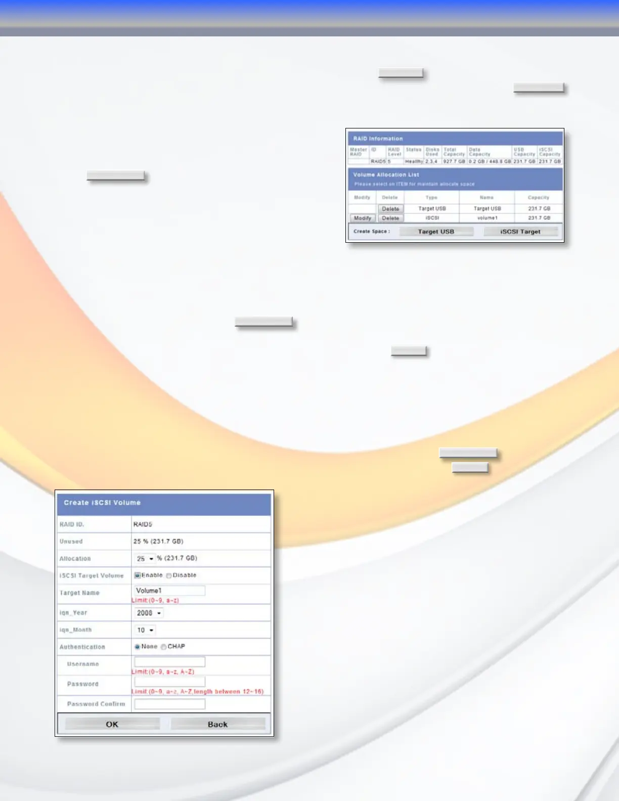 To allocate space for an iSCSI volume on the current RAID volume, click