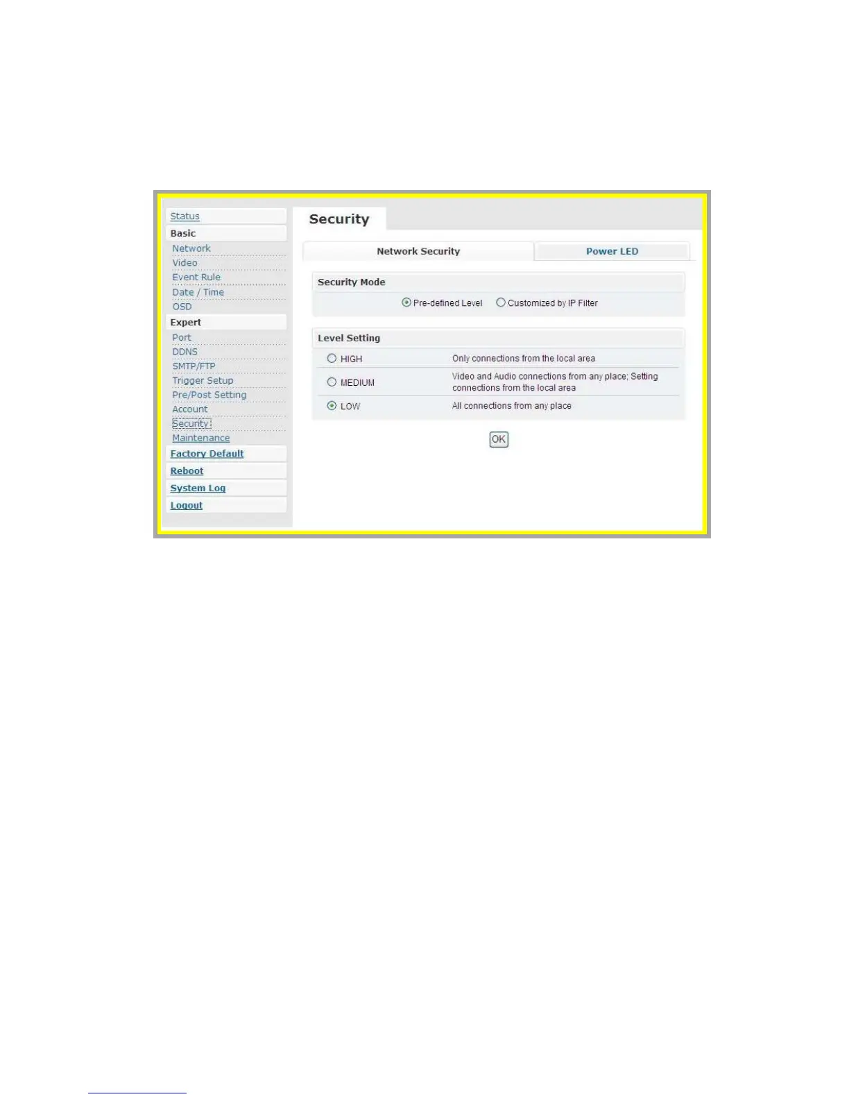 The default setting of security is LOW.