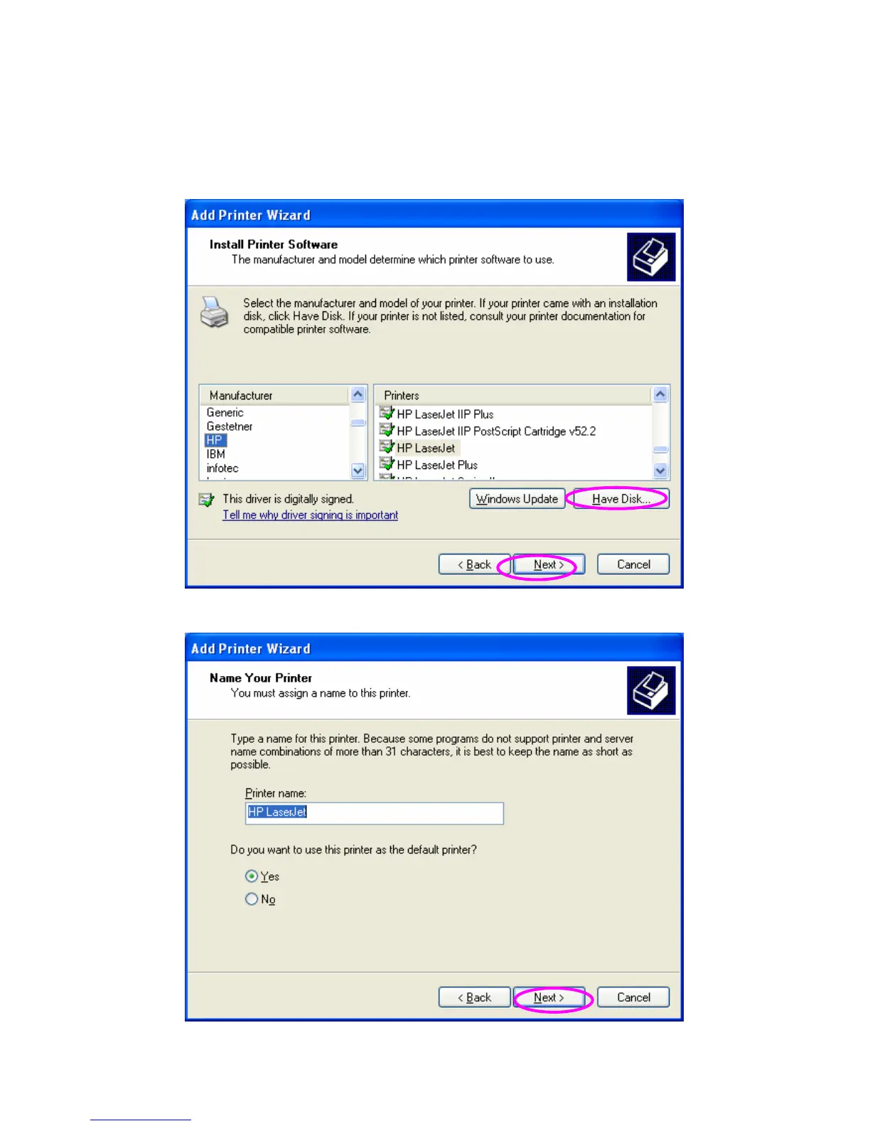 click “Next”. If your printer is not in the list, click “Have Disk…” to