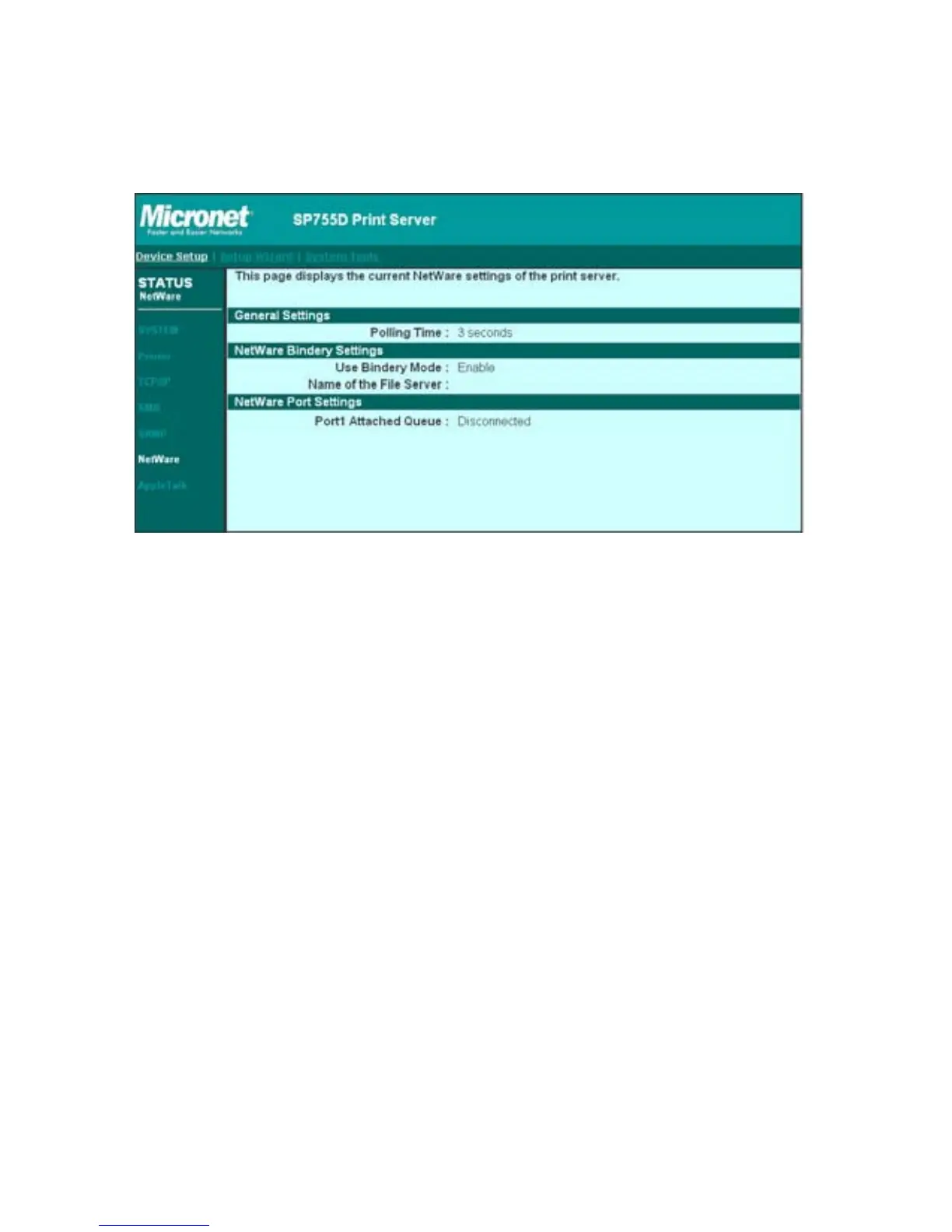 This page lists NetWare settings, including “Polling Time”, “Use Bindery