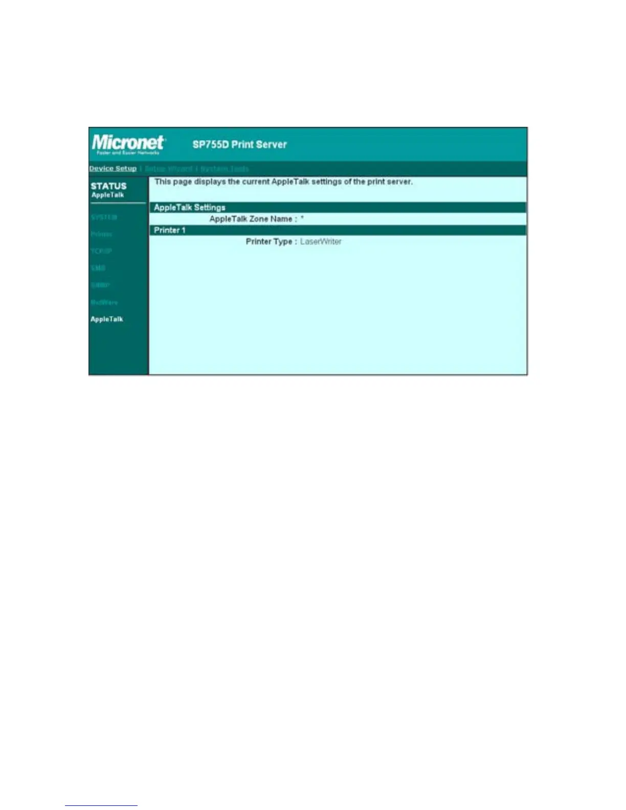 This page lists AppleTalk settings, including “AppleTalk Zone Name” and