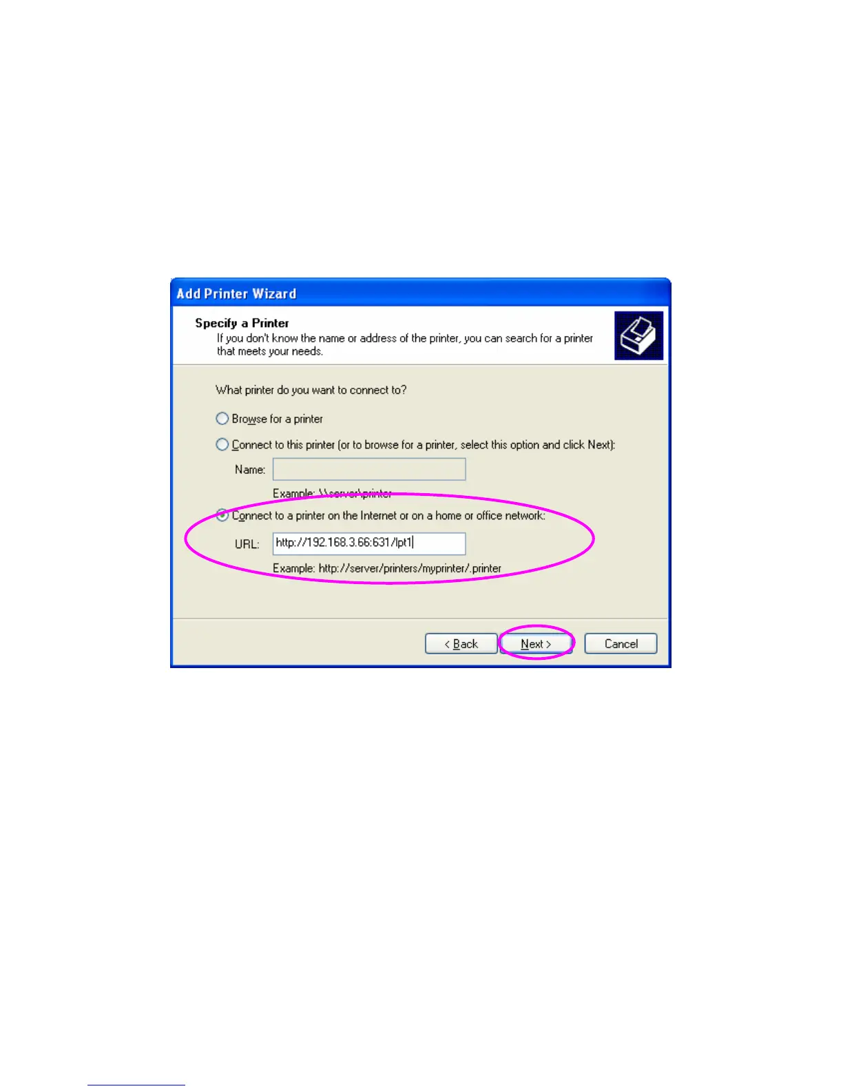 URL is http://192.168.3.66:631/lpt1. After entering the URL of