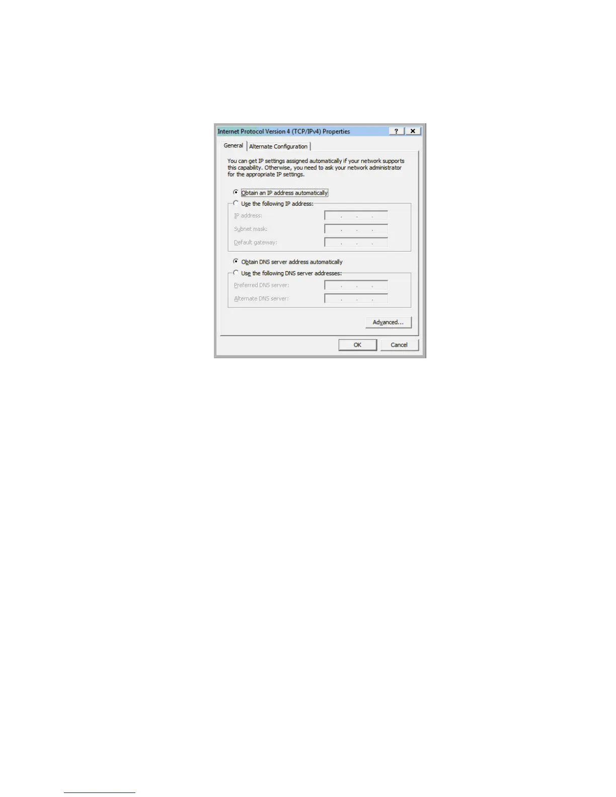 2. Select <Obtain an IP address automatically> and <Obtain DNS server