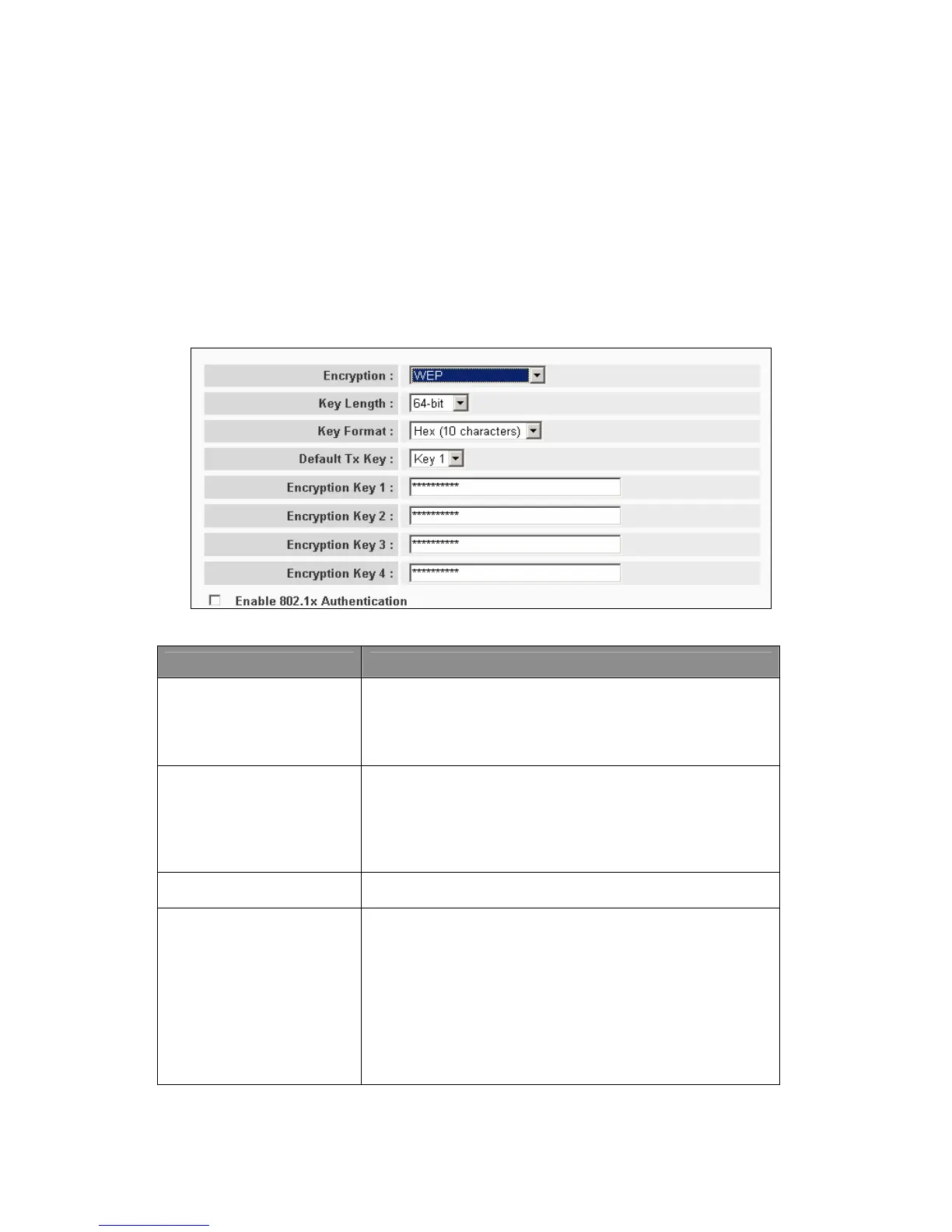 Users can select the WEP key length for encryption, 64-bit or