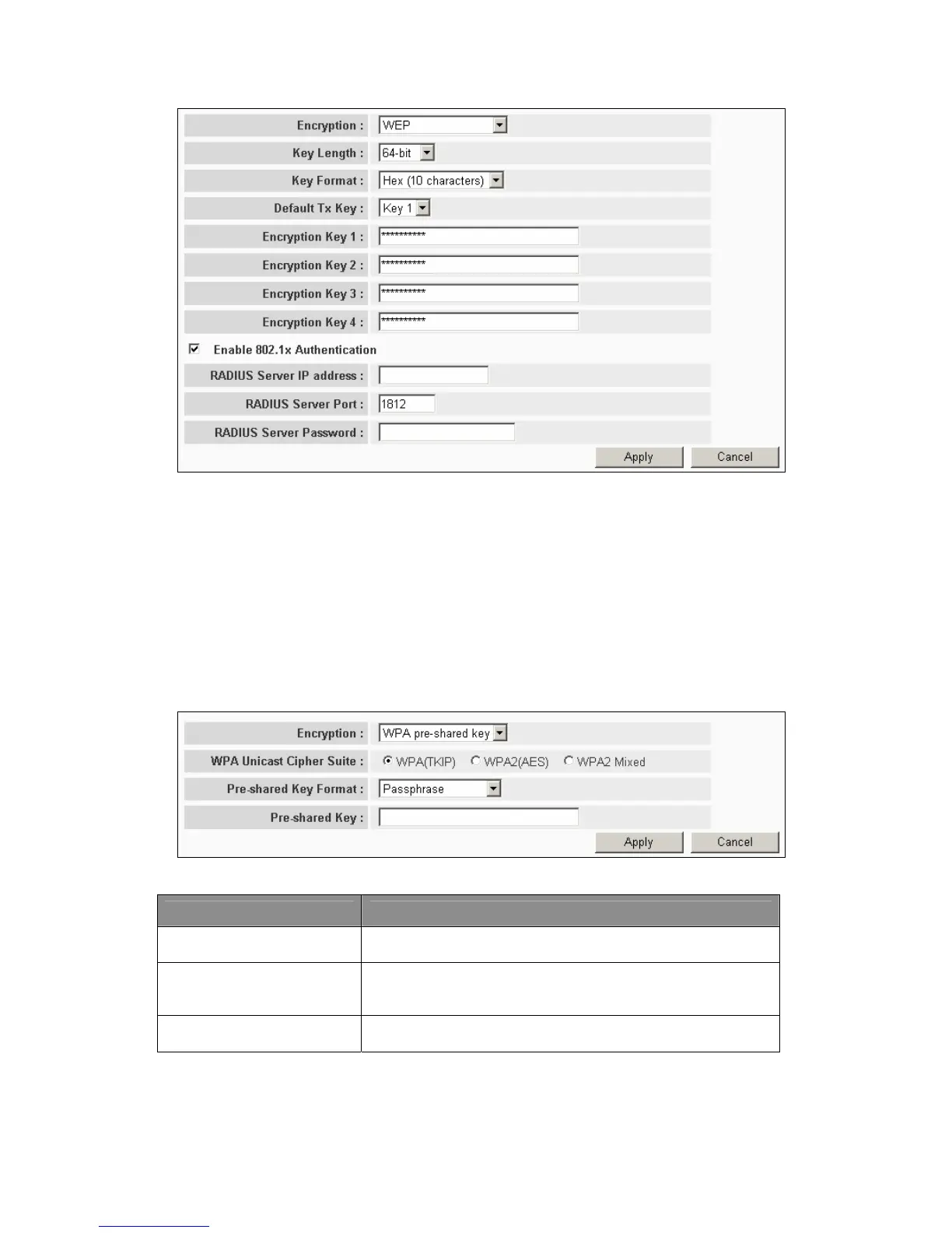 Refer to relevant sections for WEP and 802.1x configurations.