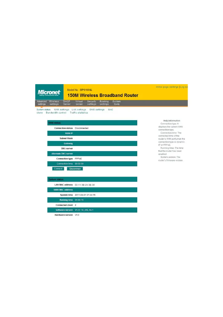 System status screen allows you to view the router’s WAN port status and