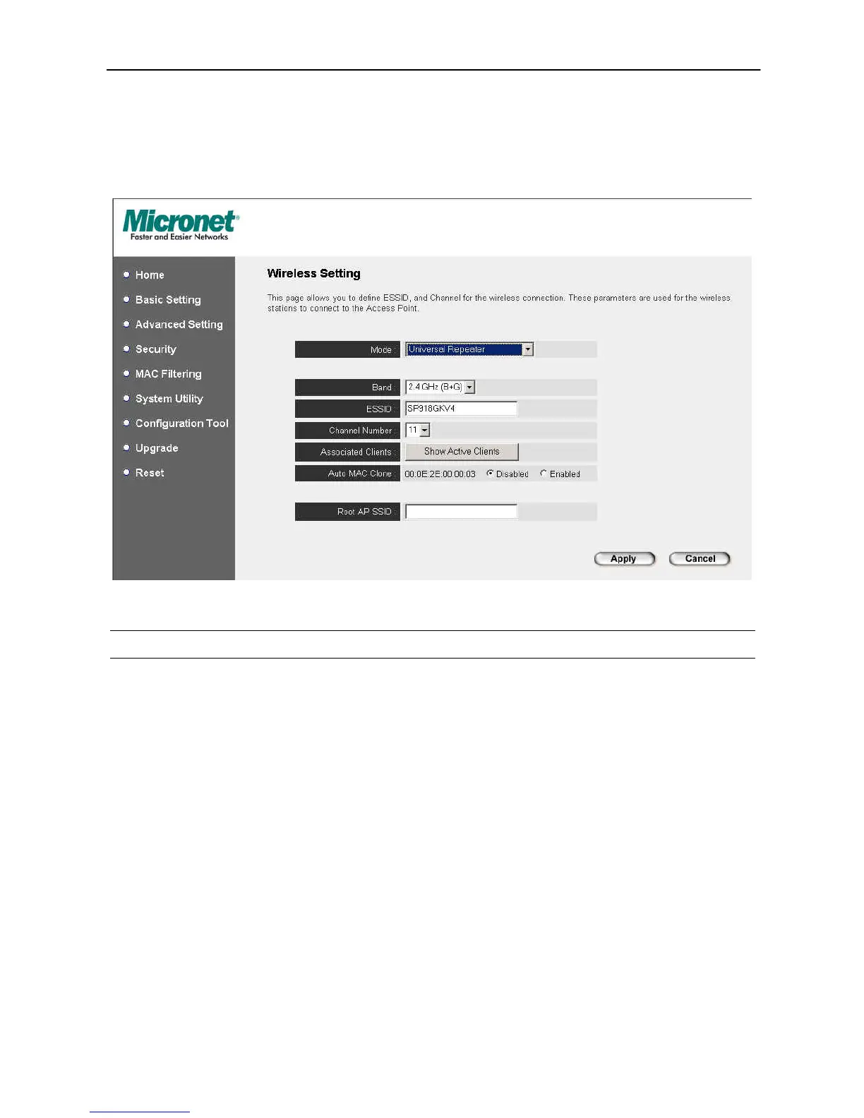 Universal Repeater mode setting page: provides the function to act as AP