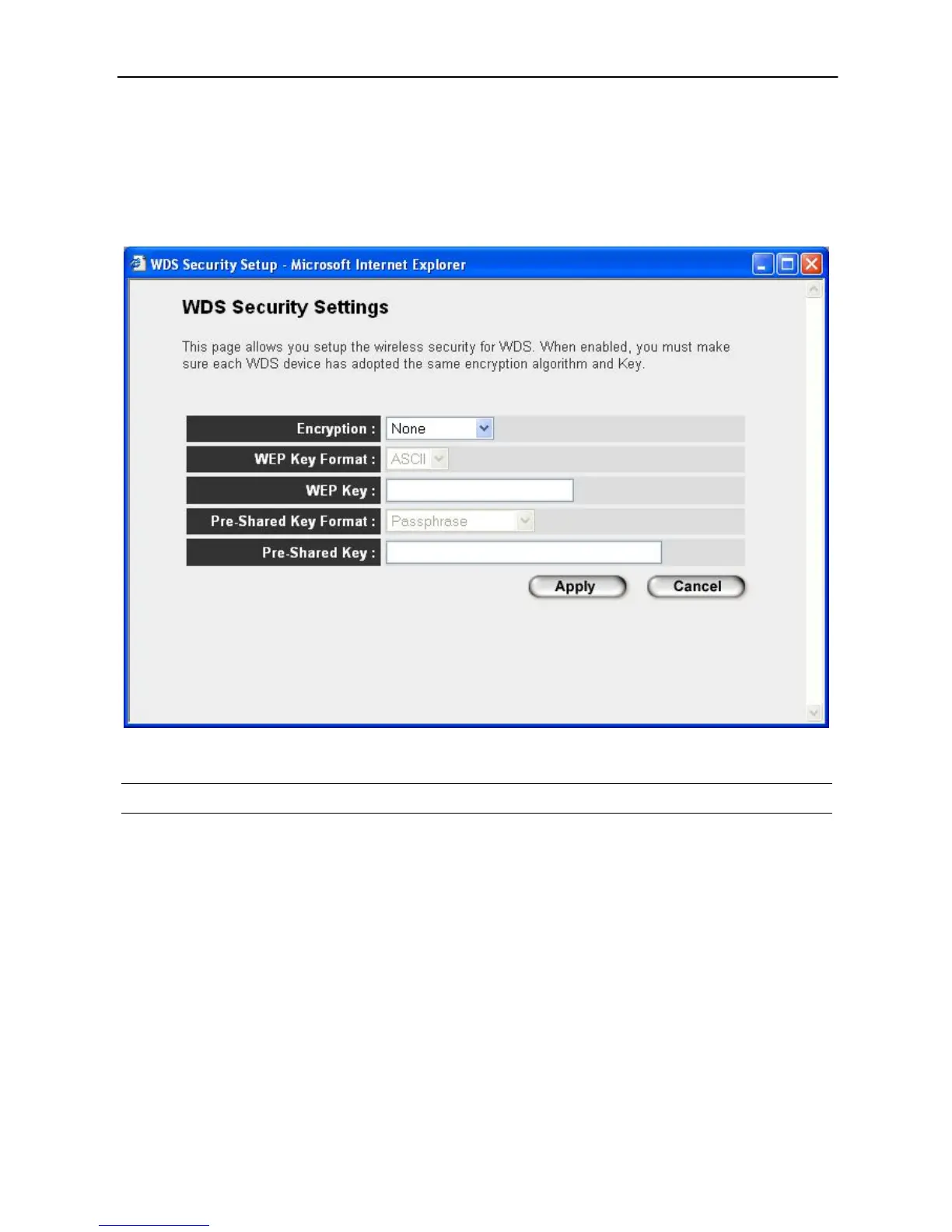 You can select “No encryption”,“WEP 64bits”, “WEP 128bits”, “WPA (TKIP)”