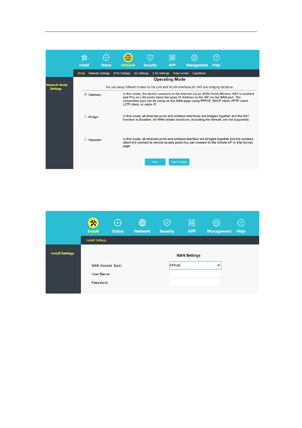 In the router management interface, click "Install-Install Settings" and select "PPPoE". Fill in