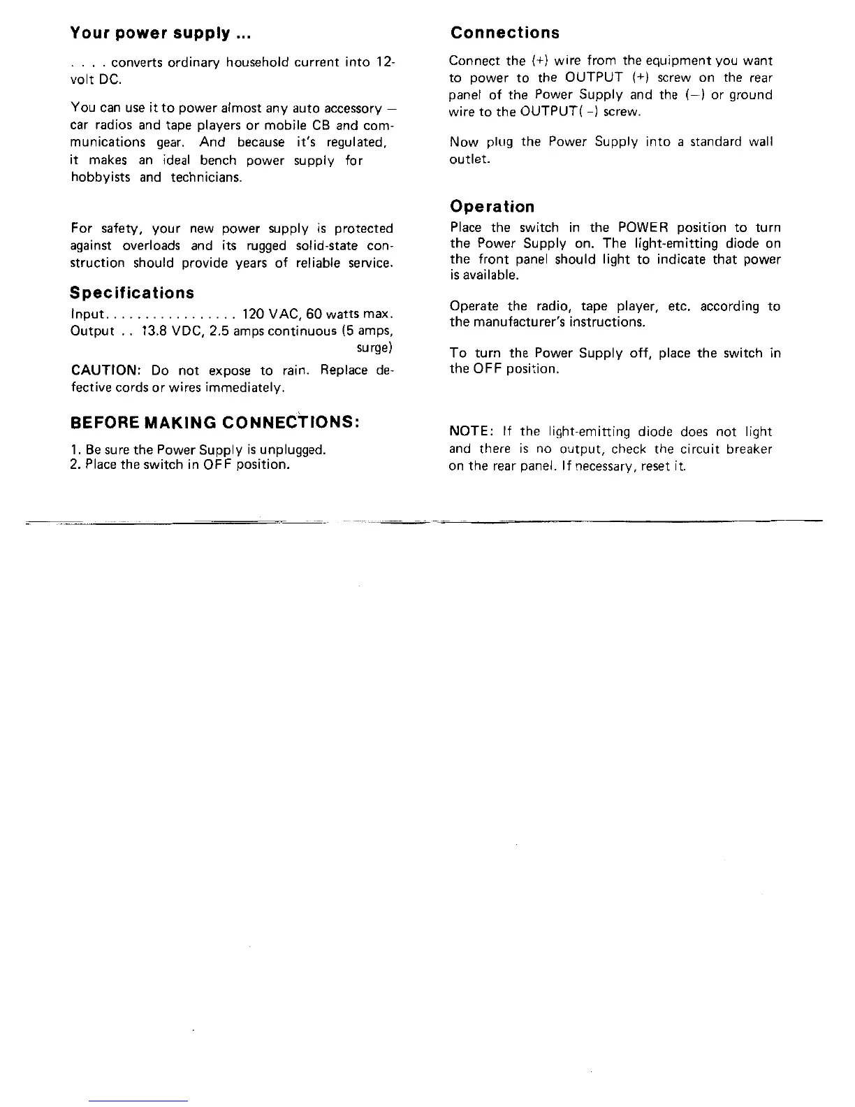 Micronta 22-124A - Power Supply Overview and Setup; Specifications; Before Making Connections; Usage and Operation