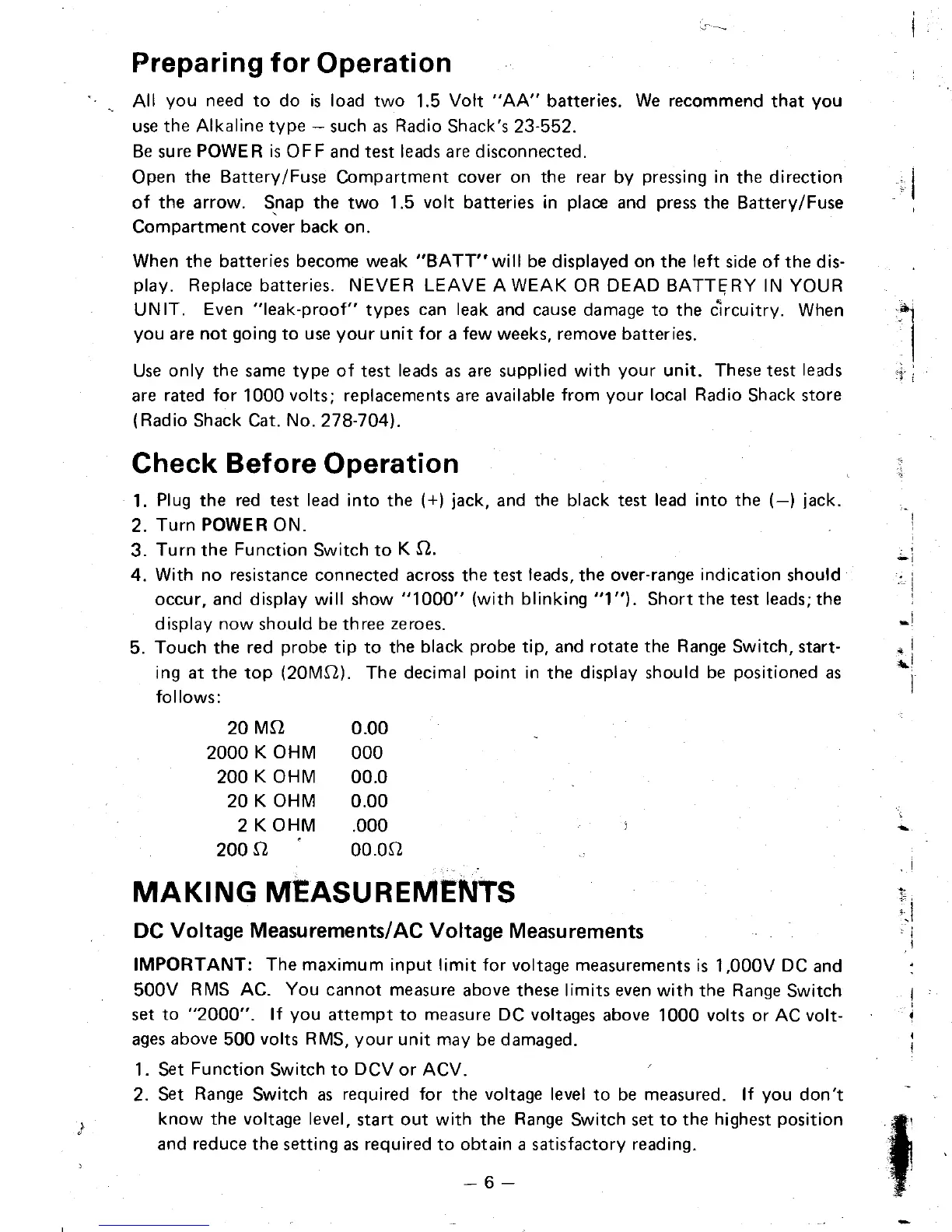 Micronta 22-191 - Preparation and Measurement Guide; Preparing for Operation; Checking Before Operation; Performing Measurements
