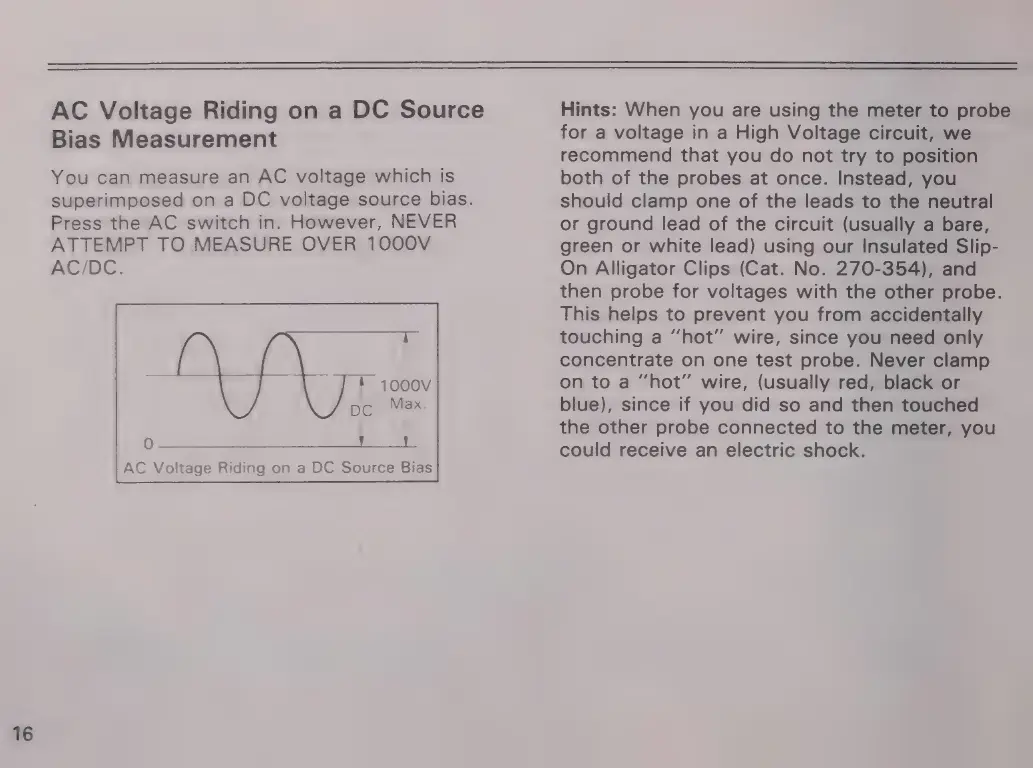 Micronta 22-195A - AC VOLTAGE ON DC BIAS MEASUREMENT; Measuring Superimposed AC; High Voltage Safety Hints