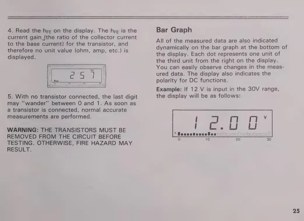 Micronta 22-195A - HFE MEASUREMENT AND BAR GRAPH DISPLAY; Reading hFE and Safety; Bar Graph Functionality