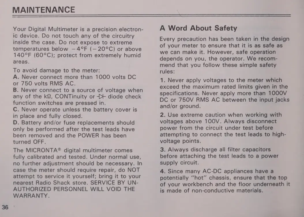 Micronta 22-195A - METER MAINTENANCE AND SAFETY; Meter Care and Protection; Operational Safety Rules