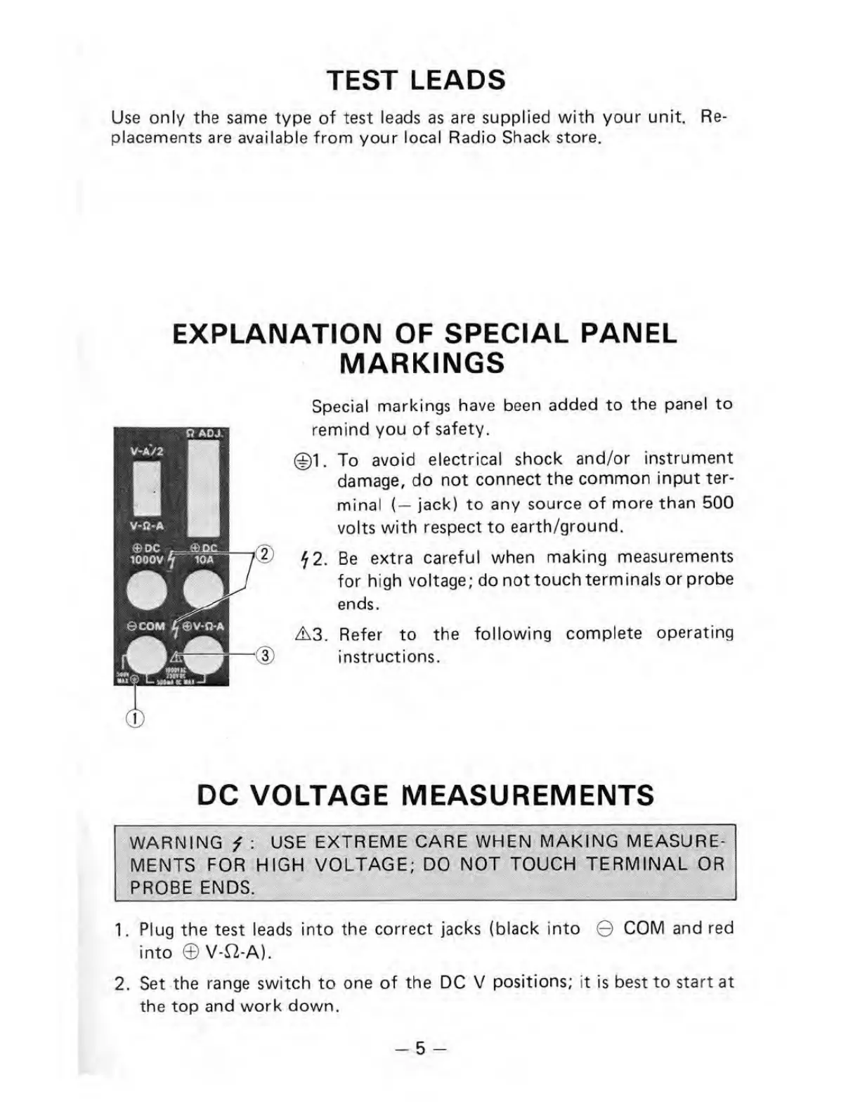 Micronta 22-204C - Special Panel Markings Explanation; Common Input Terminal Warning; High Voltage Measurement Caution; Reference to Operating Instructions