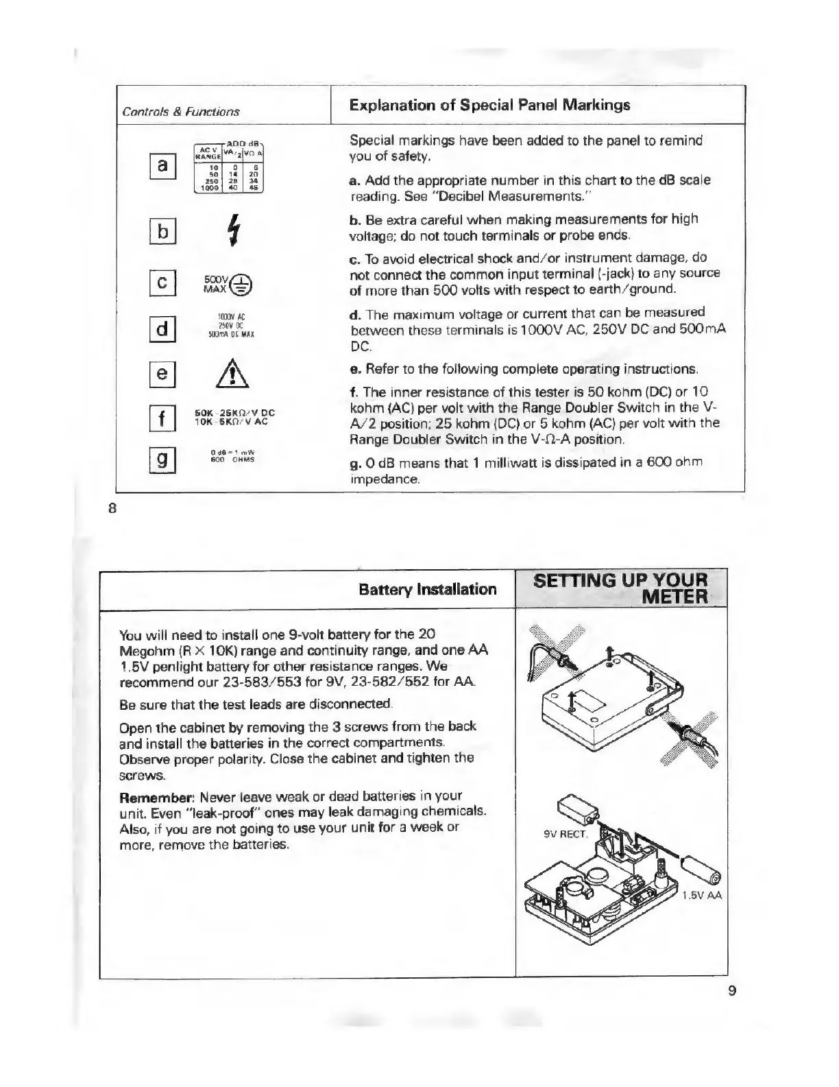 Micronta 22-214A - Setting Up Your Meter; Battery Installation; Explanation of Special Panel Markings
