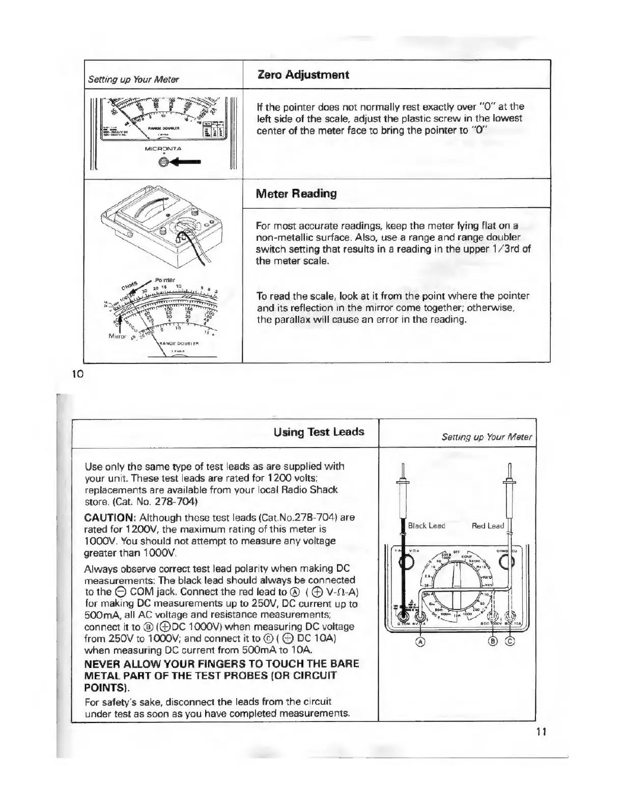 Micronta 22-214A - Setting Up Your Meter; Zero Adjustment; Meter Reading