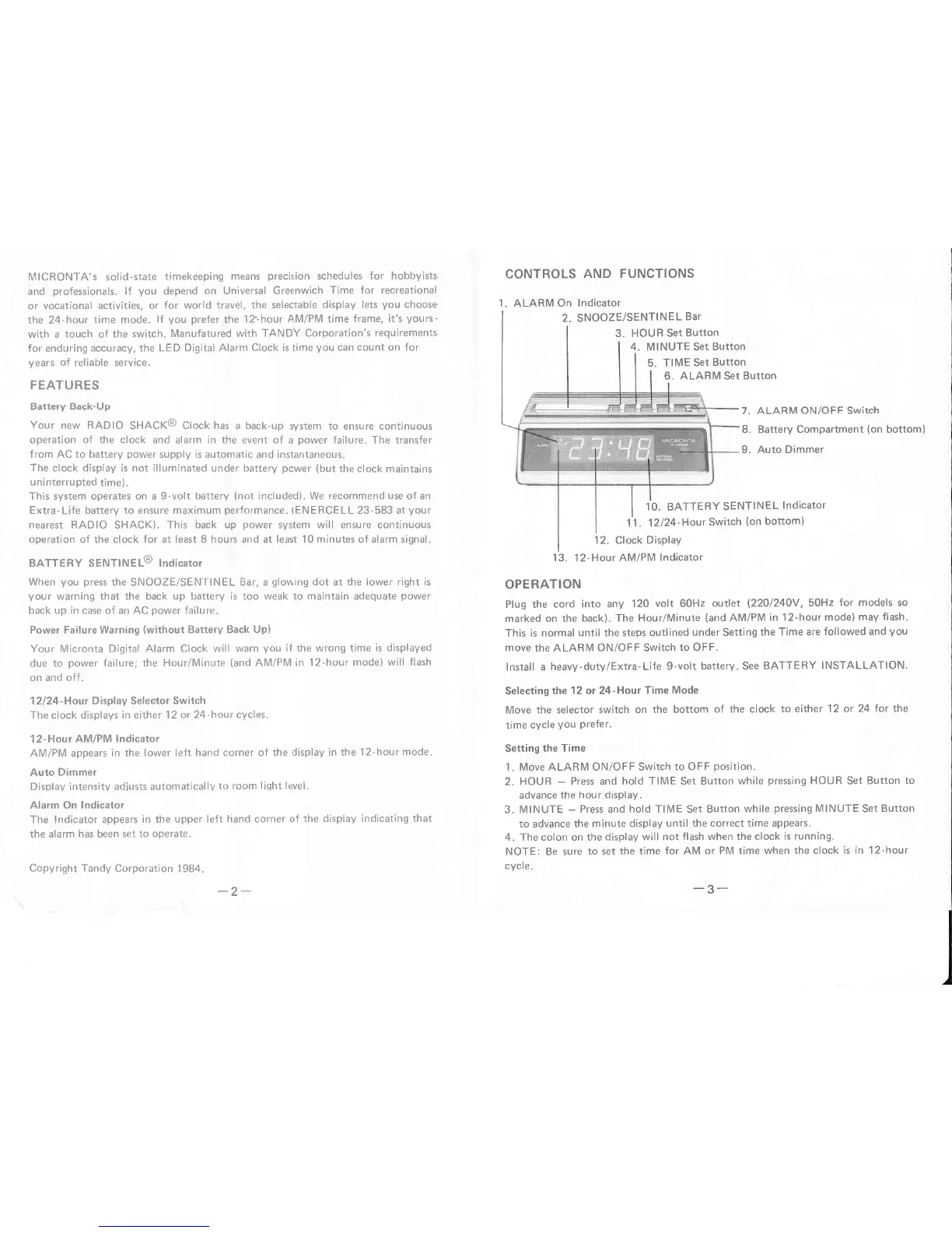 Micronta 63-753A - Clock Features; Battery Back-Up System; BATTERY SENTINEL Indicator; Power Failure Warning