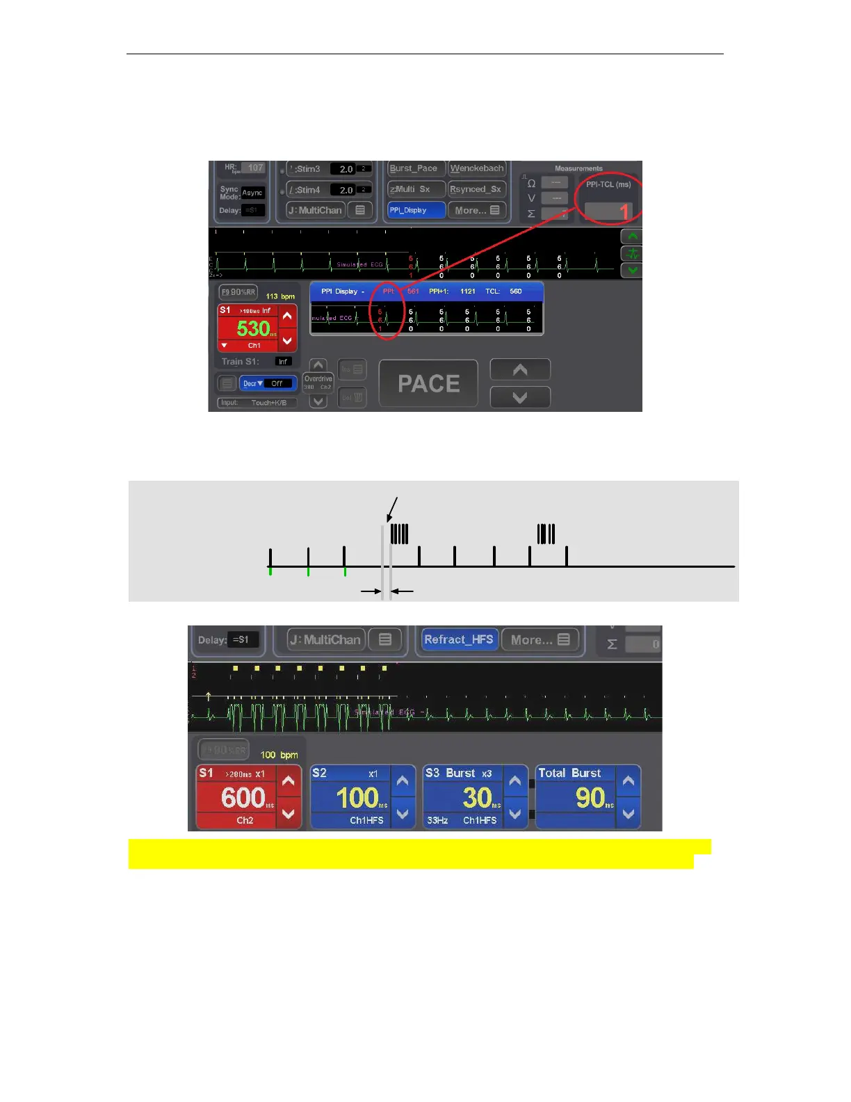 of stimuli or a duration of pacing. For example, (S1=40ms, train of 3) or (S1=40ms train for 80ms).