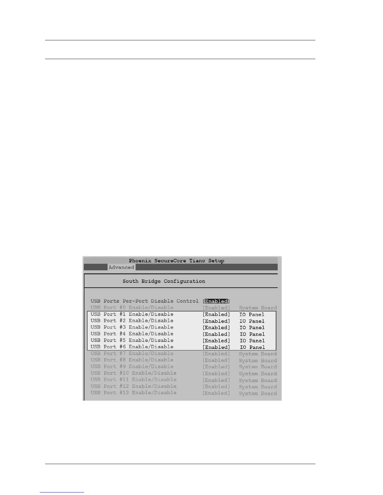 6. To disable one or more IO Panel USB ports, scroll to the individual field