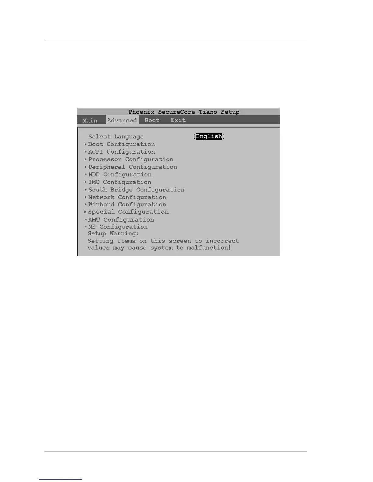 The Advanced tab contains the majority of BIOS settings listed under a