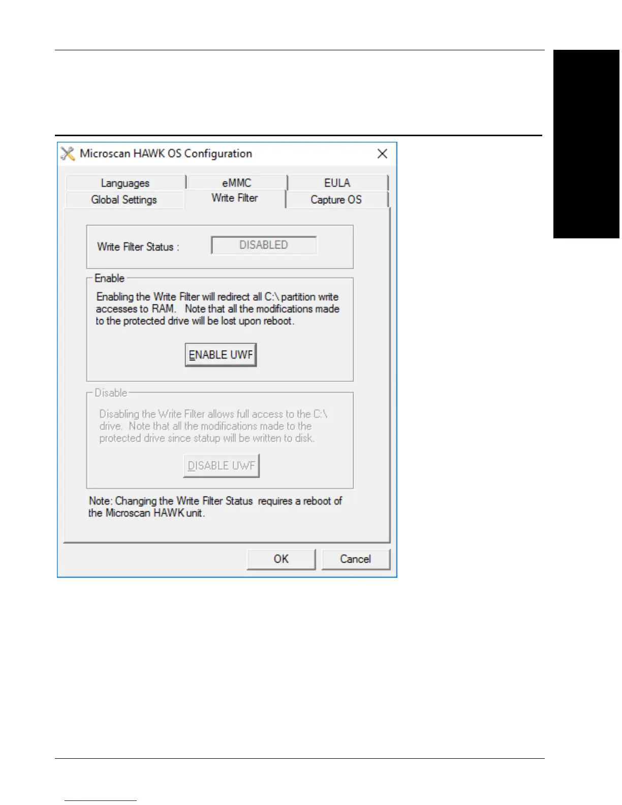 Clicking ENABLE UWF enables the Windows Universal Write Filter on the device. If you