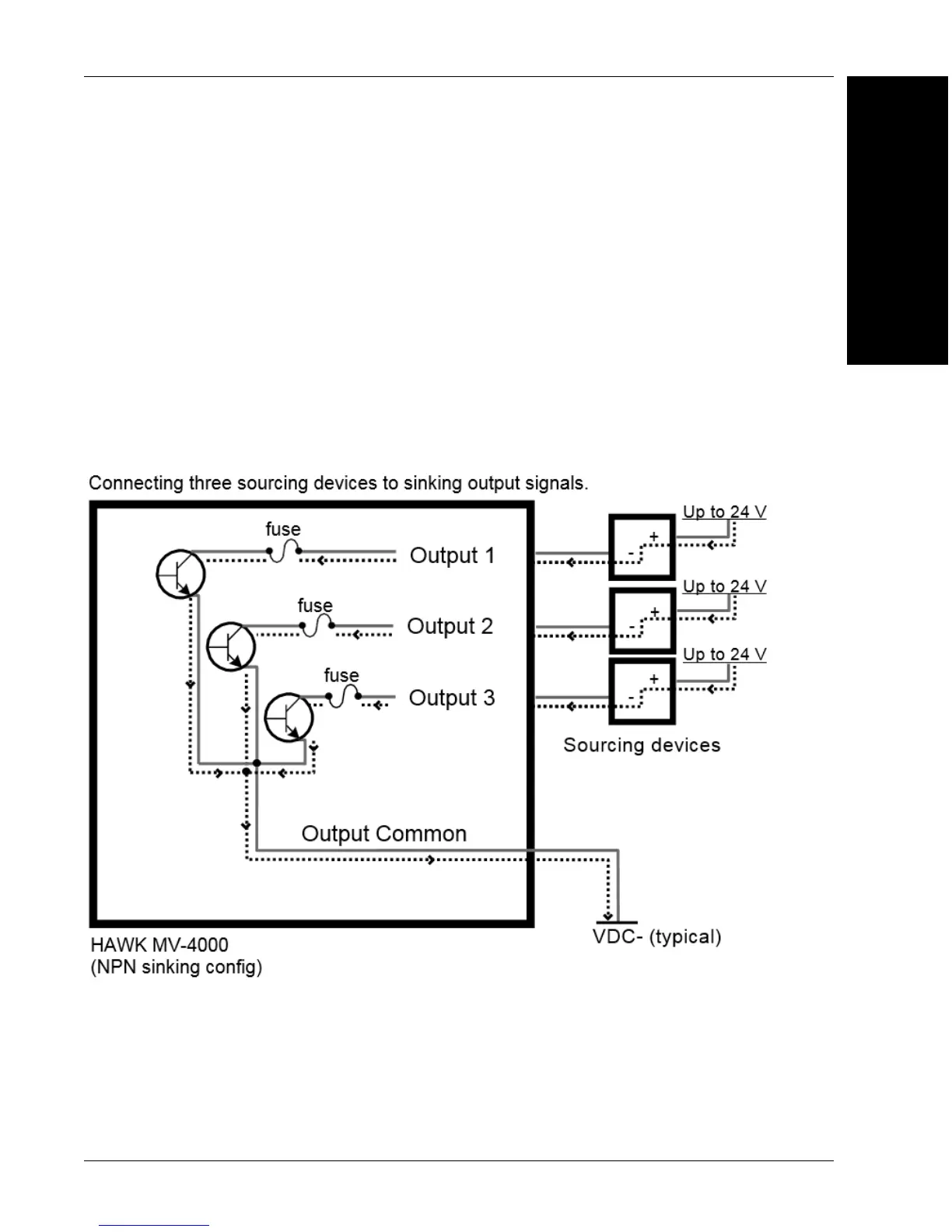 The HAWK MV-4000 output signals are sinking output signals, based on an NPN-type