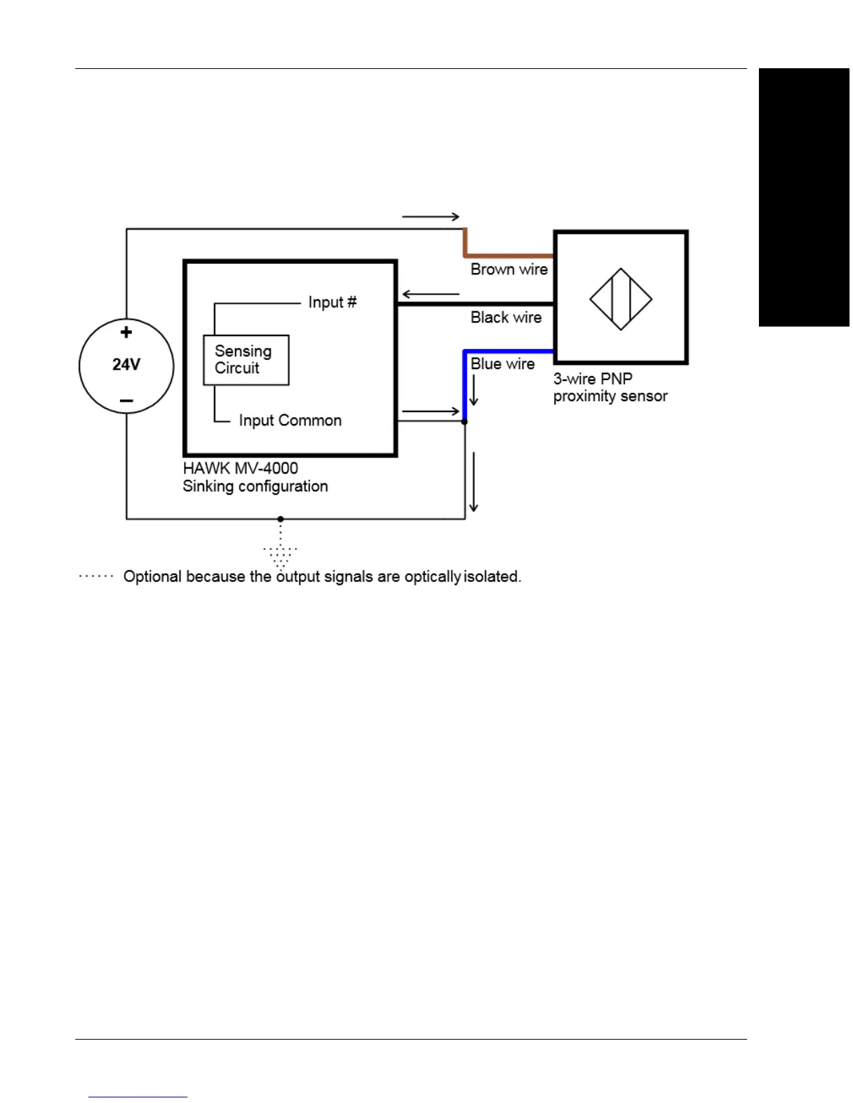 Connect a 3-wire PNP proximity sensor to a HAWK MV-4000 input signal, as shown below.