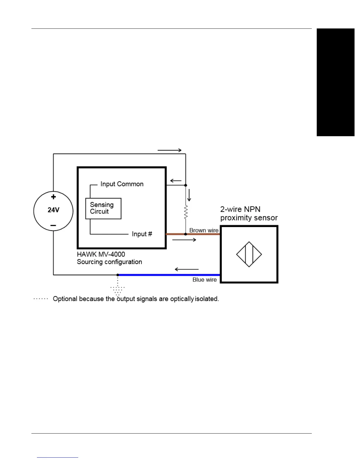 You can connect a 2-wire proximity sensor to a HAWK MV-4000 input signal in either a