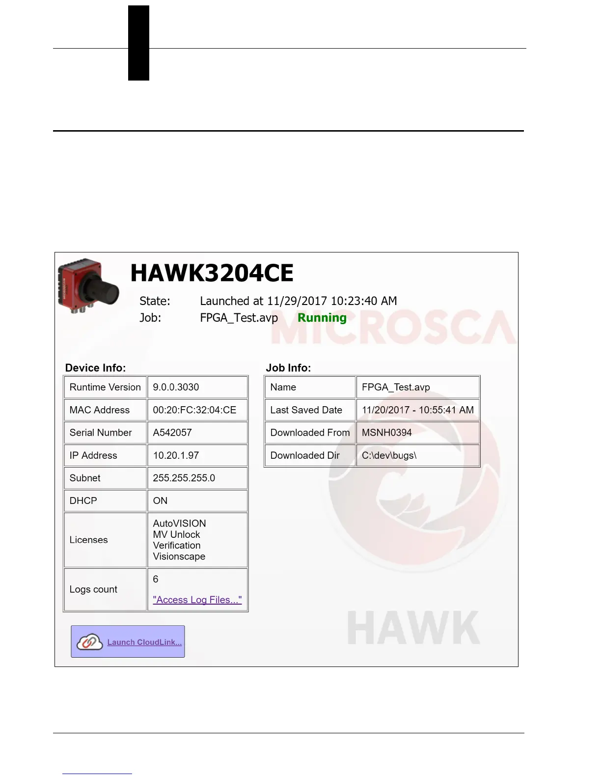 The HAWK MV-4000 Smart Camera provides a “health status” web page that can be