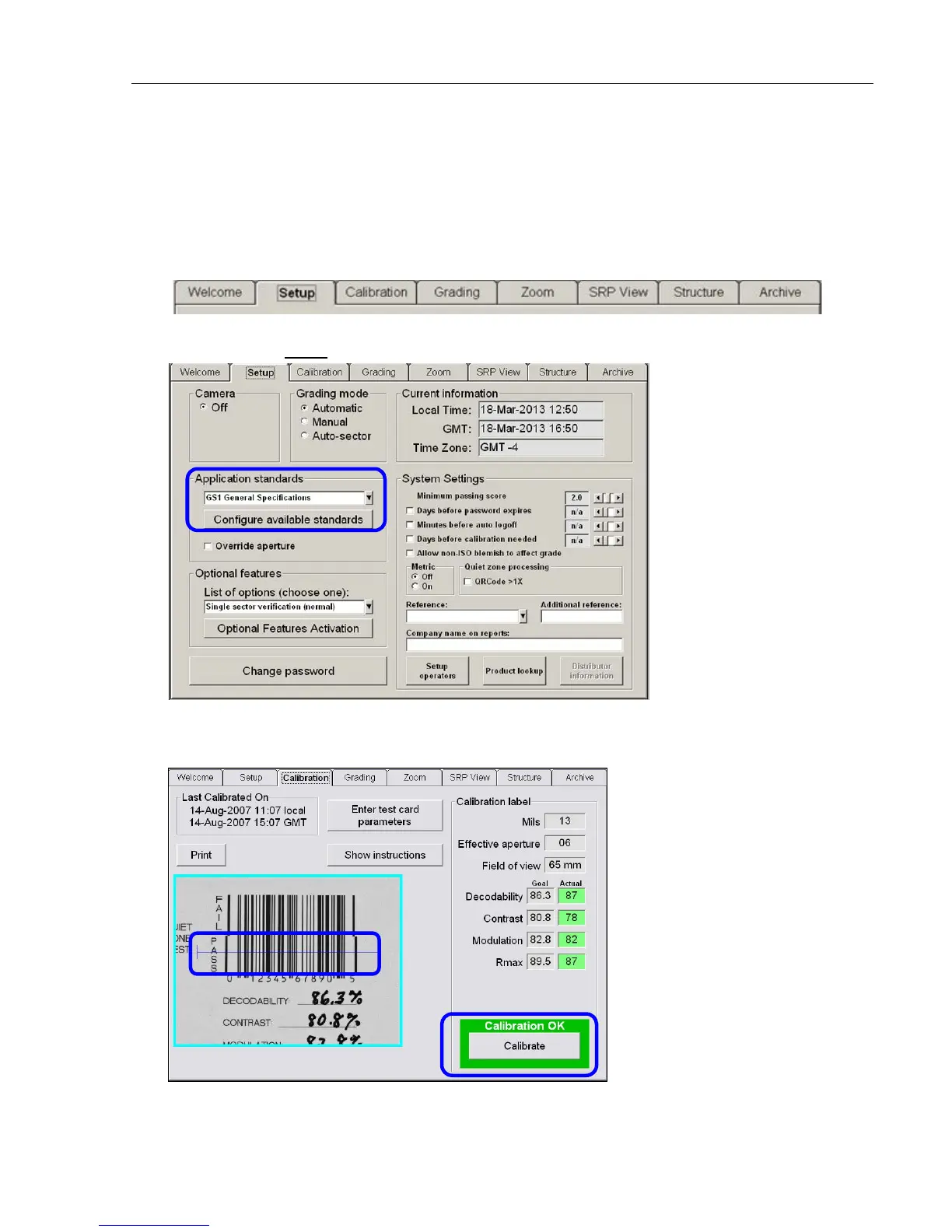 4. Click the Calibration tab and calibrate the system by placing either of the Master Grade barcodes