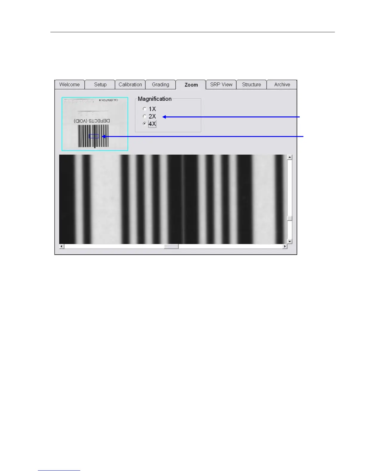 To further evaluate the quality of barcode symbols, the Zoom Tab screen allows you to magnify the barcode