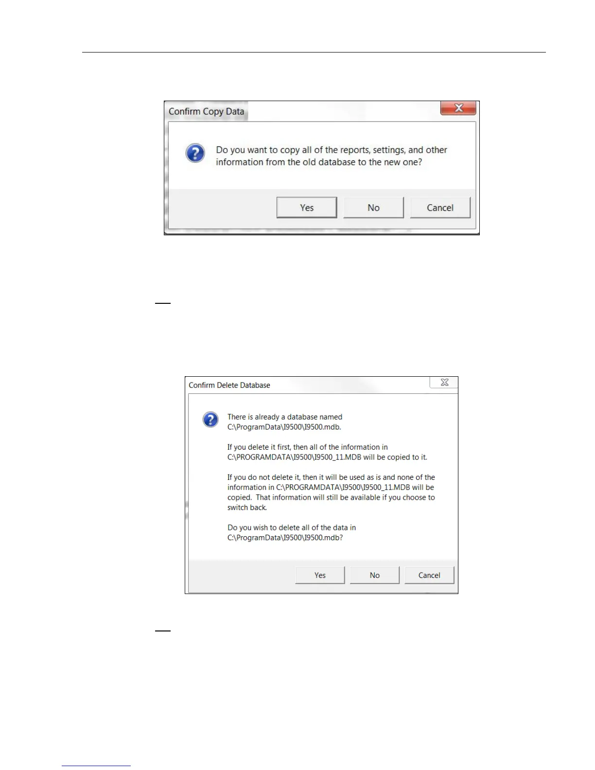 • Click Yes to copy the reports, settings and other information from the old database to the new database.