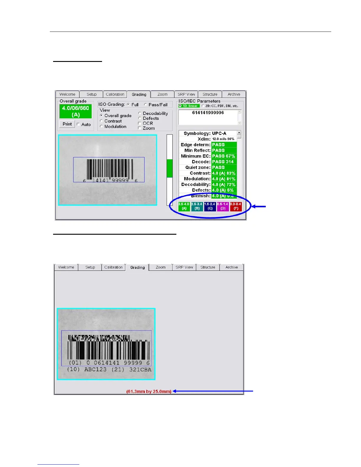 The system reports ISO/IEC grades by a color code. The bottom right of the Grading Tab screen shows a