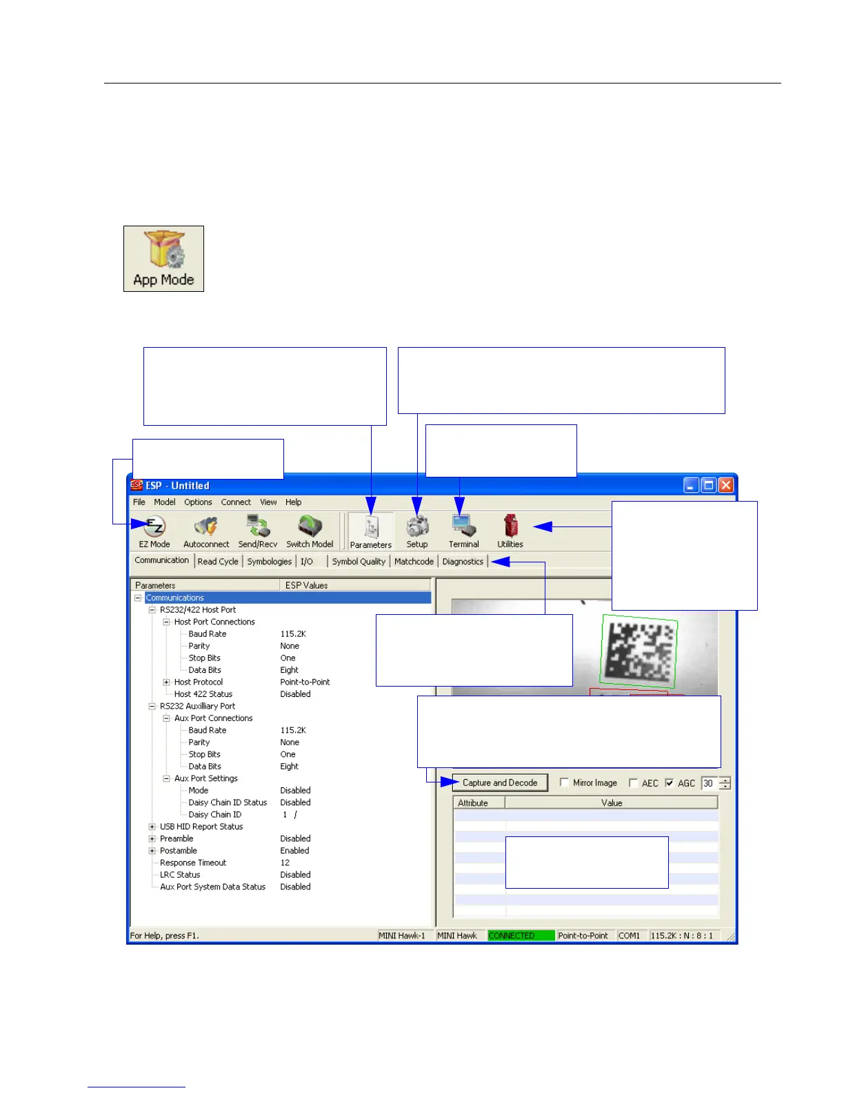 Note: The App Mode and EZ Mode buttons appear in the same position to allow easy