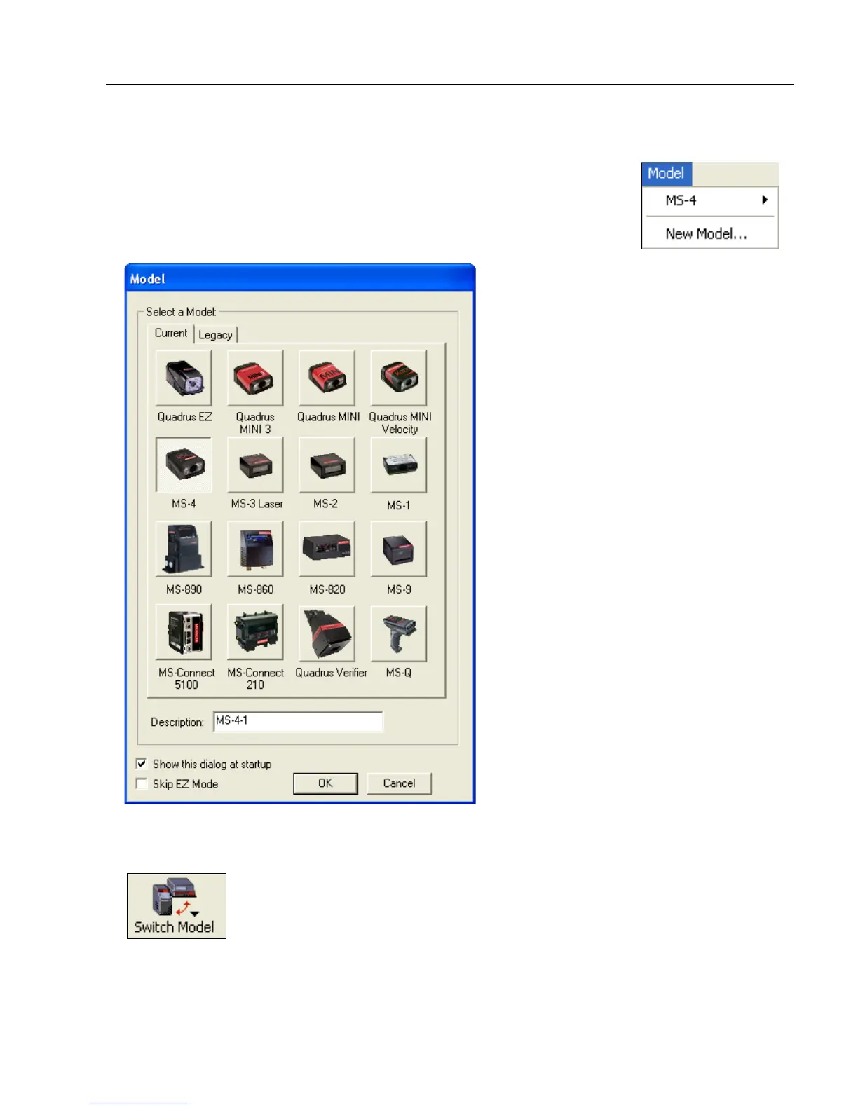 menu and that the same menu is repeated when clicking the Switch Model icon.