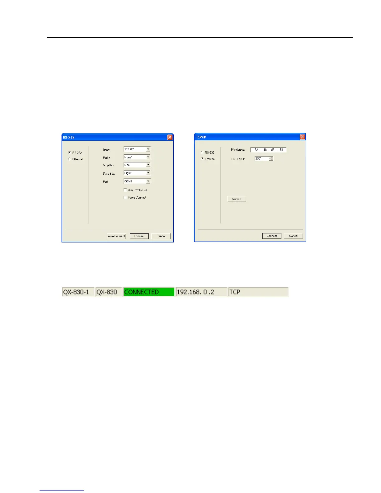 • Configure RS-232 or Ethernet settings as required by the application, and click Connect.