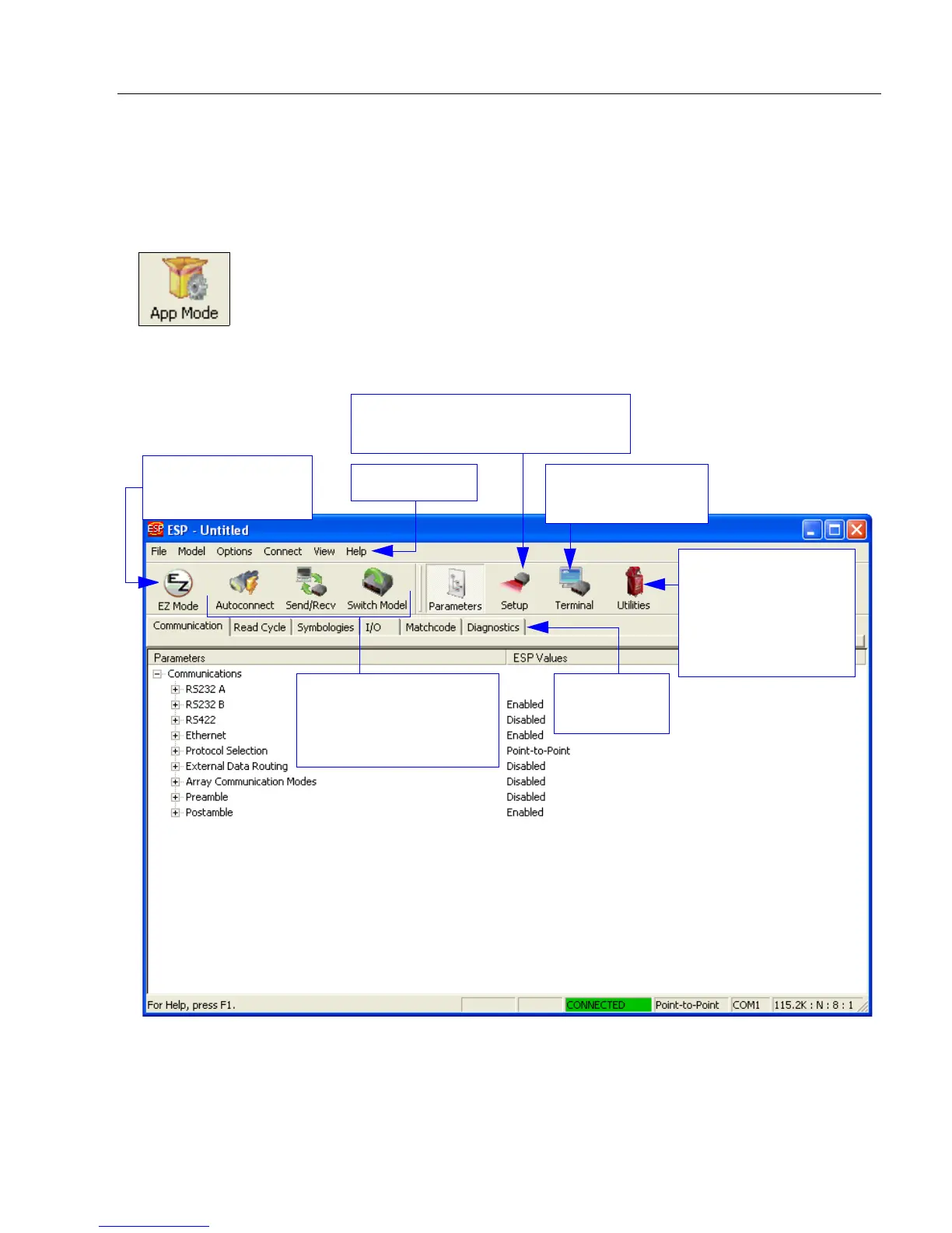 Note: The App Mode and EZ Mode buttons appear in the same position to allow easy