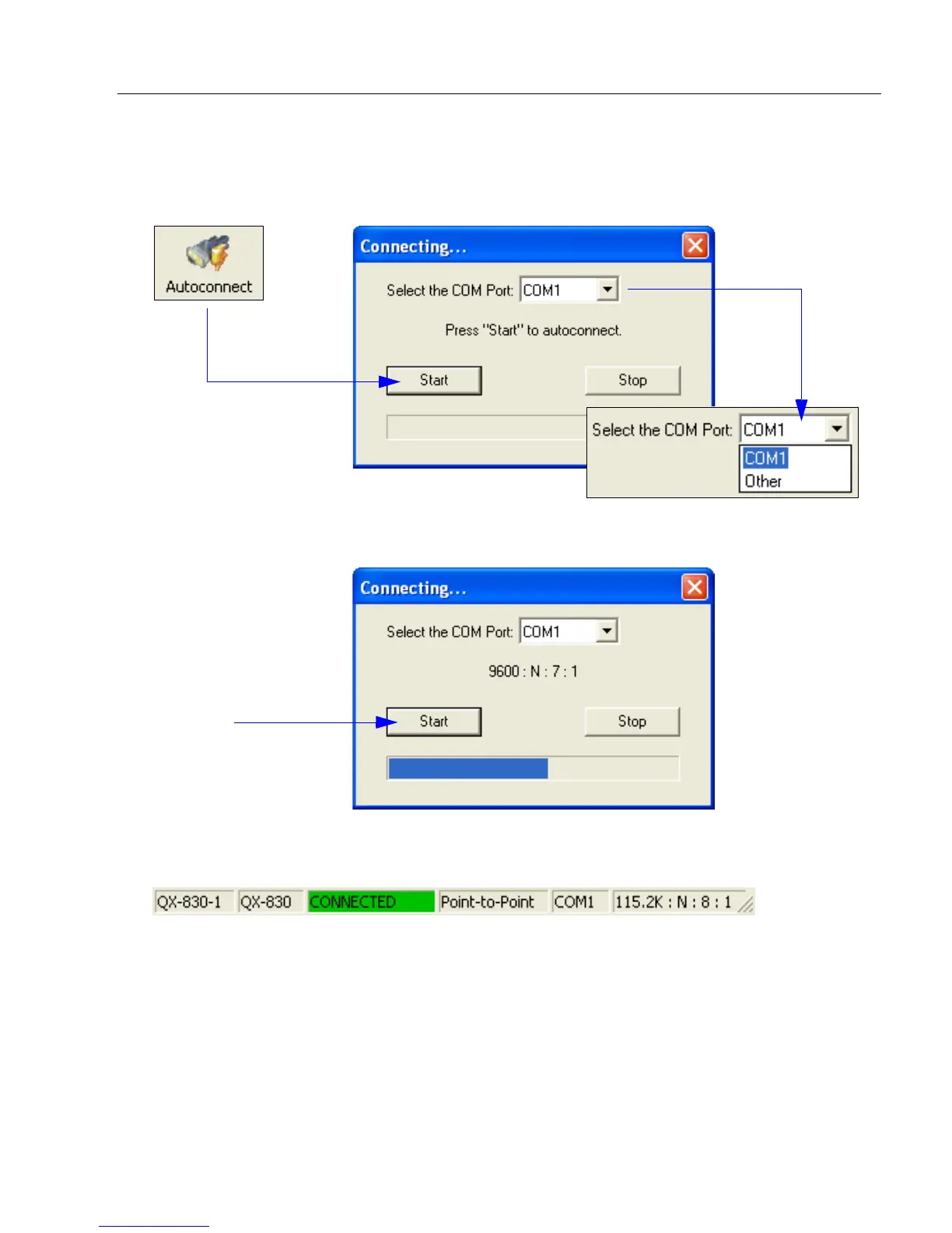 • If the communication port is not the default COM1, use the dropdown menu to change