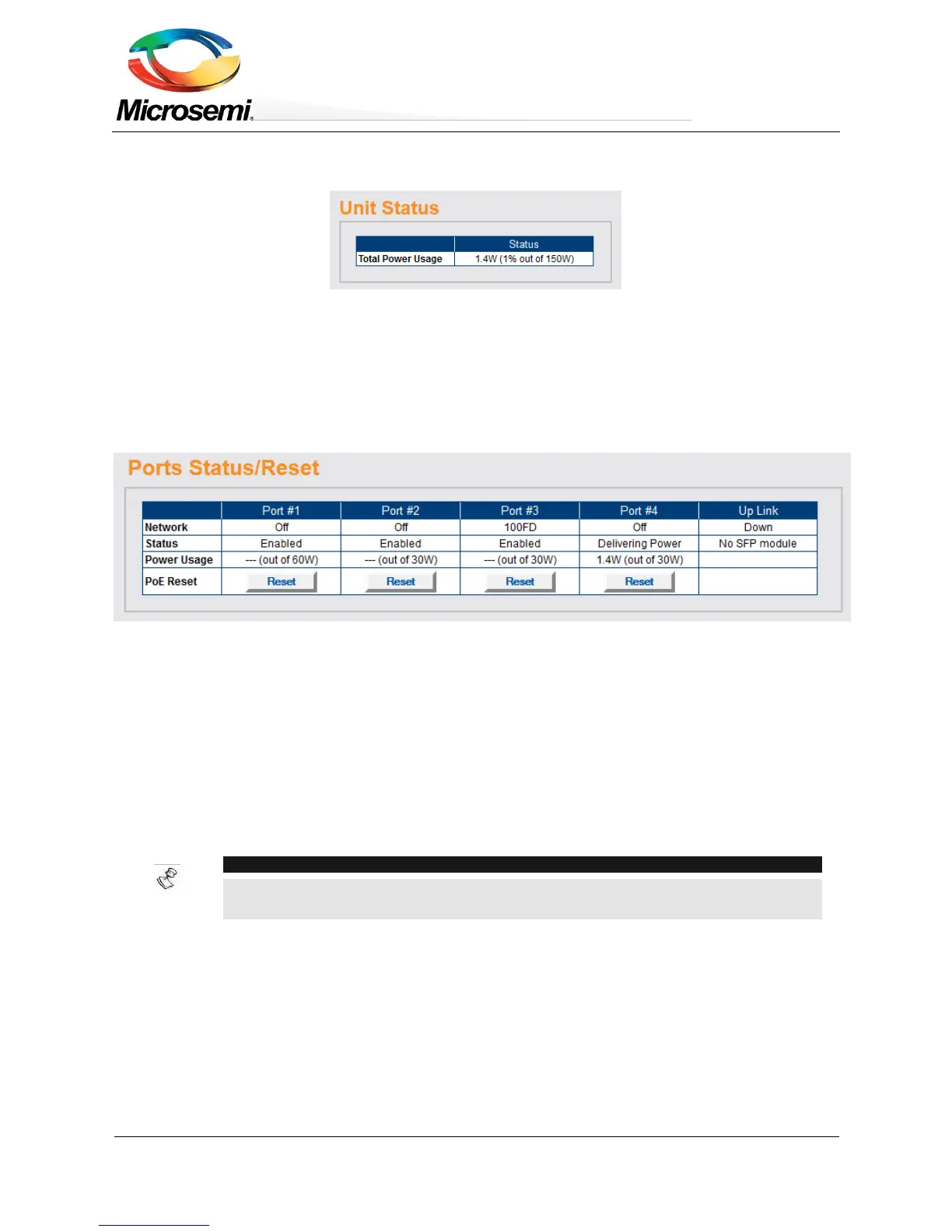 Status – reports for each port the PoE port status as enabled, disabled, delivering-power, etc.