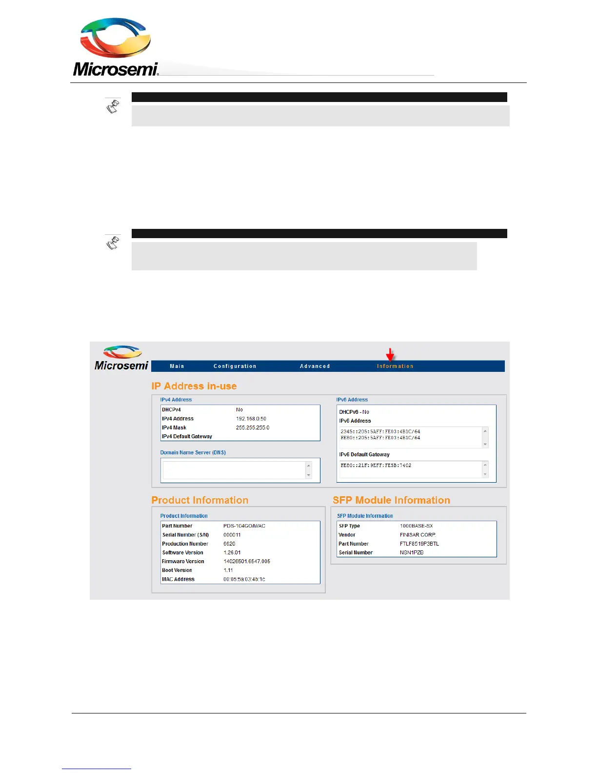 Information Web page provides information on current IPv4 and IPv6 addresses, SFP module plus